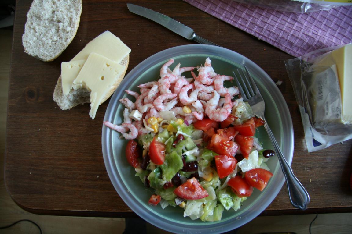 Im Hotel angekommen werden die Garnelen gepuhlt und der Salat aufgeteilt. Dazu gibt es Brot bzw. für Jan und mich Brötchen, die ich gerade noch gekauft habe, mit Käse. Sehr lecker und wir sind ziemlich satt davon.