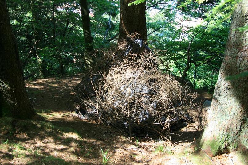 Ich nehme die nächste Abkürzung und die war wohl nicht so recht als Abkürzung vorgesehen.... zwar endet der Trampelpfad auf einer Felsplatte, von der man wieder einen neuen Blick hat. Aber danach weiß ich nicht mehr so recht wie es weitergehen soll... weder nach oben noch nach unten scheint nun ein Weg vorhanden zu sein. Egal, da muss ich jetzt weiter. Steil über Felsen geht es abwerks und dann finde ich diese Behausung eines "Waldschrates" - der hat sich bestimmt auch nicht geacht, das da jemand mal vorbei kommt. Na, der kennt Hamburger Touristen nicht. Er scheint aber nicht zuhause zu sein. Ein stück weiter finde ich doch eine Möglichkeit wieder auf den normalen Weg zu stoßen und habe dann auch die Zivilisation wieder erreicht