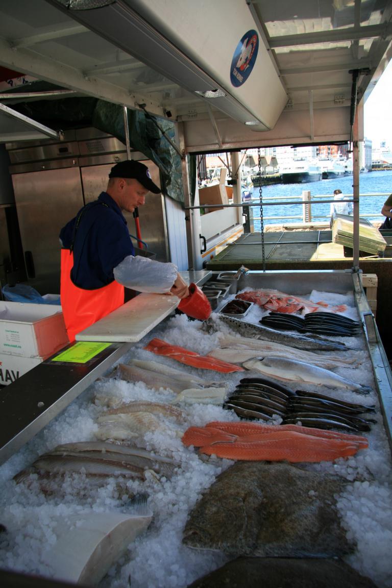 Auf dem Fischmarkt werden Fisch und viele Gerichte mit Fisch angeboten, aber auch Elchwurst, norwegische Pullover und Andenken und Obst. Hier ist noch Erdbeerzeit und 500 g kosten 35 Kronen also 5 Euro. Die Garnelen=Rekker sind hier frisch fast doppelt so teuer wie in Tromsö