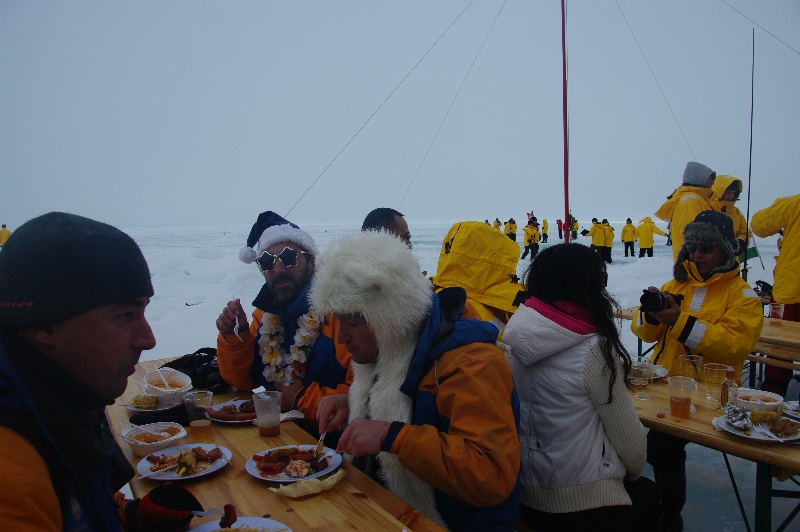 Die 120 Passagiere waren aus 20 Nationen, den größten Anteil hatte eine ca. 50-köpfige Gruppe von Chinesen. Zweitgrößte Nation: Die USA, vertreten durch etliche prominente und einflussreiche Personen, wie ich später herausgefunden habe. Wir Deutschen waren zu siebt, sind also kaum aufgefallen ![]()