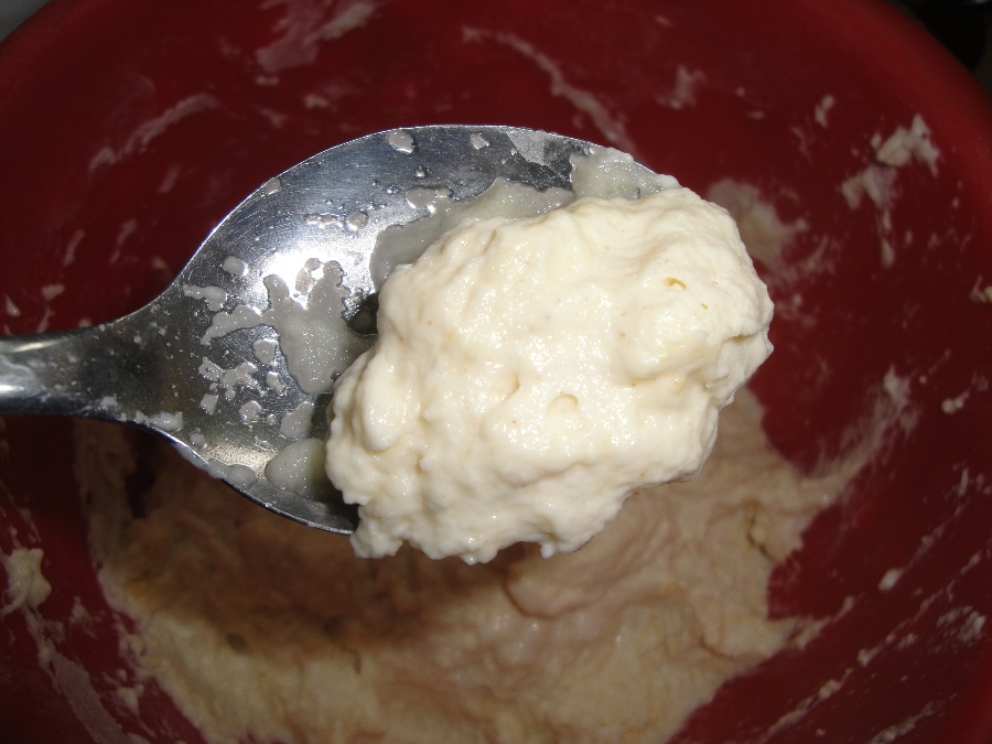 Mit einem Esslöffel Nockerl rausstechen, ca. einen halben Löffel gross und in kochendes Salzwasser geben.