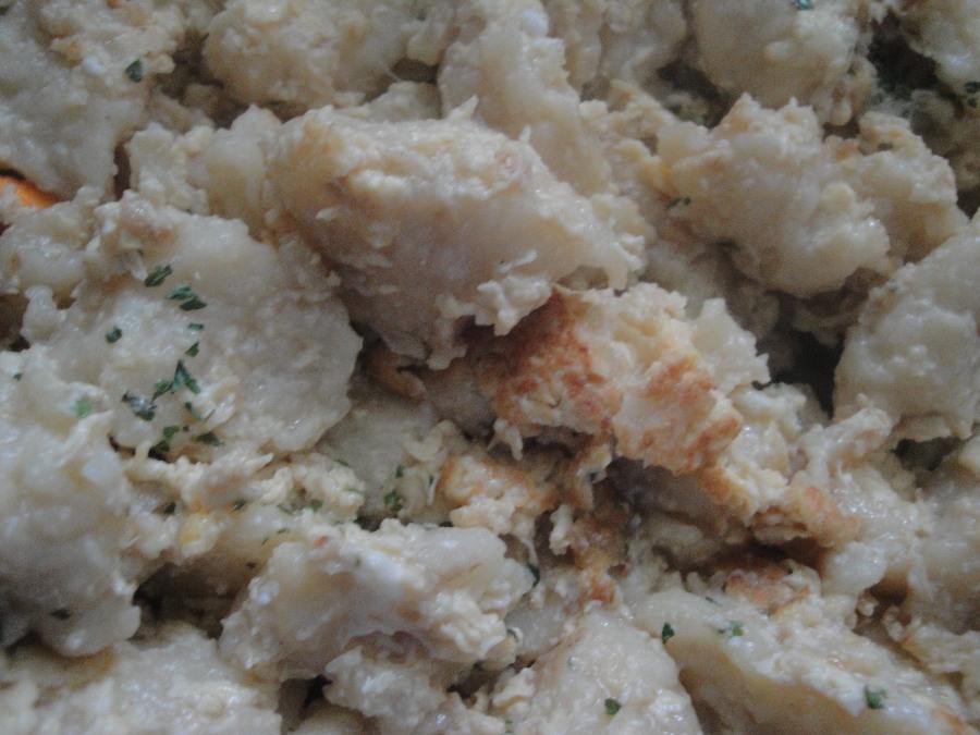 Ca. 5 Eier versprudeln und dazu leeren. Nun alles durchrühren und stocken lassen, bis unten leichte Krusten entstehen.