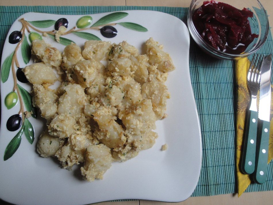 Nur Mehl, Wasser, Salz und Nockerl kochen und z.B. zum Schweinebraten dazu.