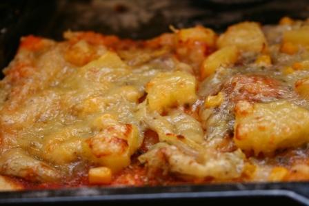 Danach kommen Zwiebel, Mais, Ananasstücke und Artischocken oder was ich halt grade mag auf die Pizza.