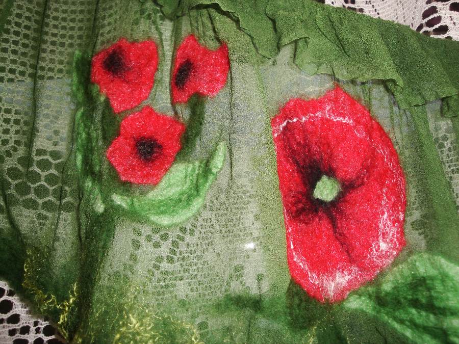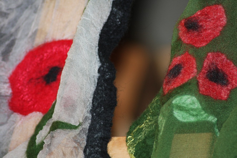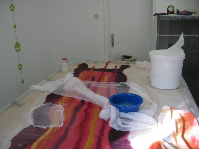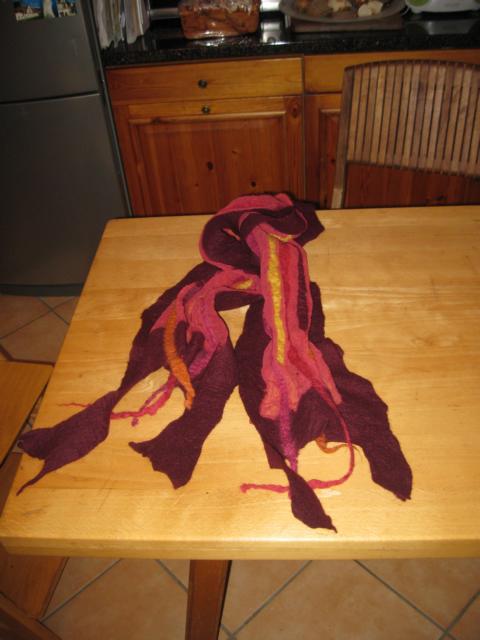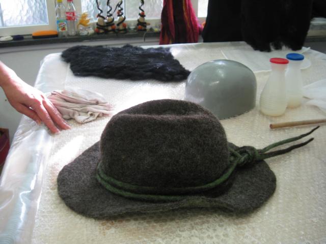 Vorrangig war ich ja wegen dem Nunofilzen da, hab dann aber auch noch für Michael einen Hut gemacht ( daß ich das Prinzip auch mal kenne) und noch passende Stulpen zu einem Schal mit 2 Schwierigkeiten - als Abschluß noch Seide einfilzen und ein innenliegendes Farbenspiel/Muster.