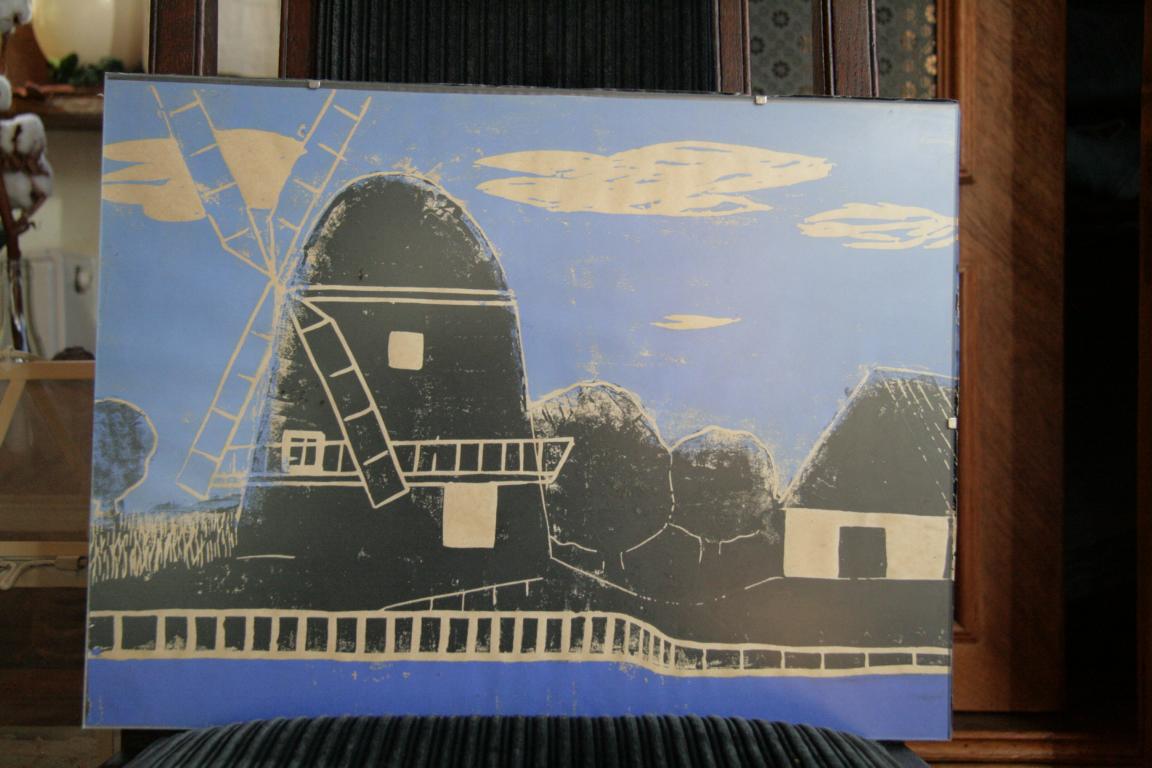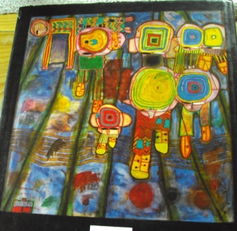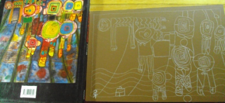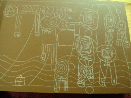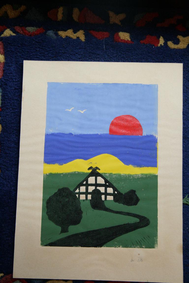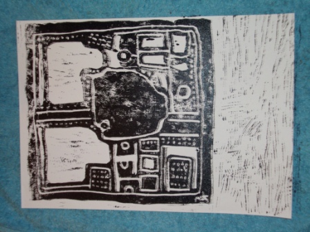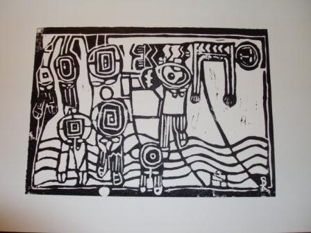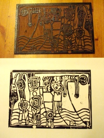 Ich habe als Erstes damit begonnen, mir ein Motiv zu suchen. Da mir selber nix gscheites eingefallen ist für den ersten Versuch, habe ich ein Bild von Hundertwasser als Vorlage genommen und hab das mit weißem Farbstift direkt auf dem Linol vorgemalt- freihand, weil ich noch nicht rausgefunden habe, wie man eine Vorlage auf das Linol pausen könnte...