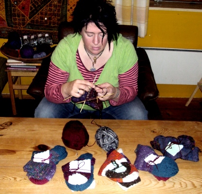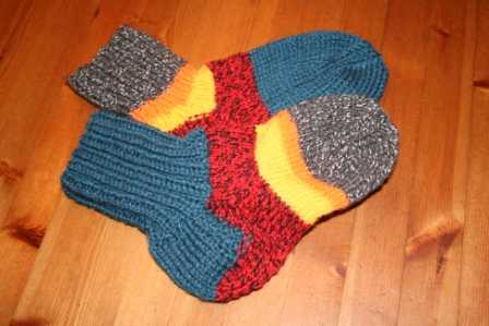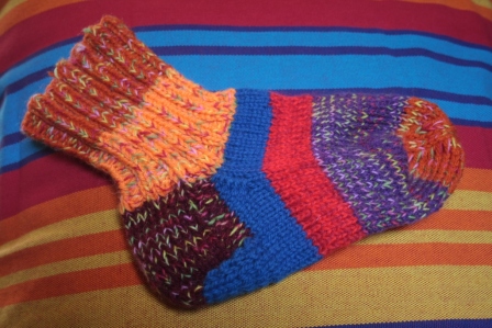Dann ziehe ich den Faden durch diese Maschen durch, drehe den Socken um und ziehe den Faden fest, sodaß sich das Loch in der Spitze schließt. Faden verknoten und vernähen, FERTIG.