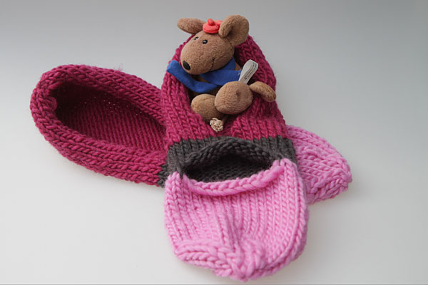 Insgesamt nun 10 Runden in Anthrazit stricken. Den Farbwechsel sollte man hinten vornehmen, also dort wo die Sohle ist.
