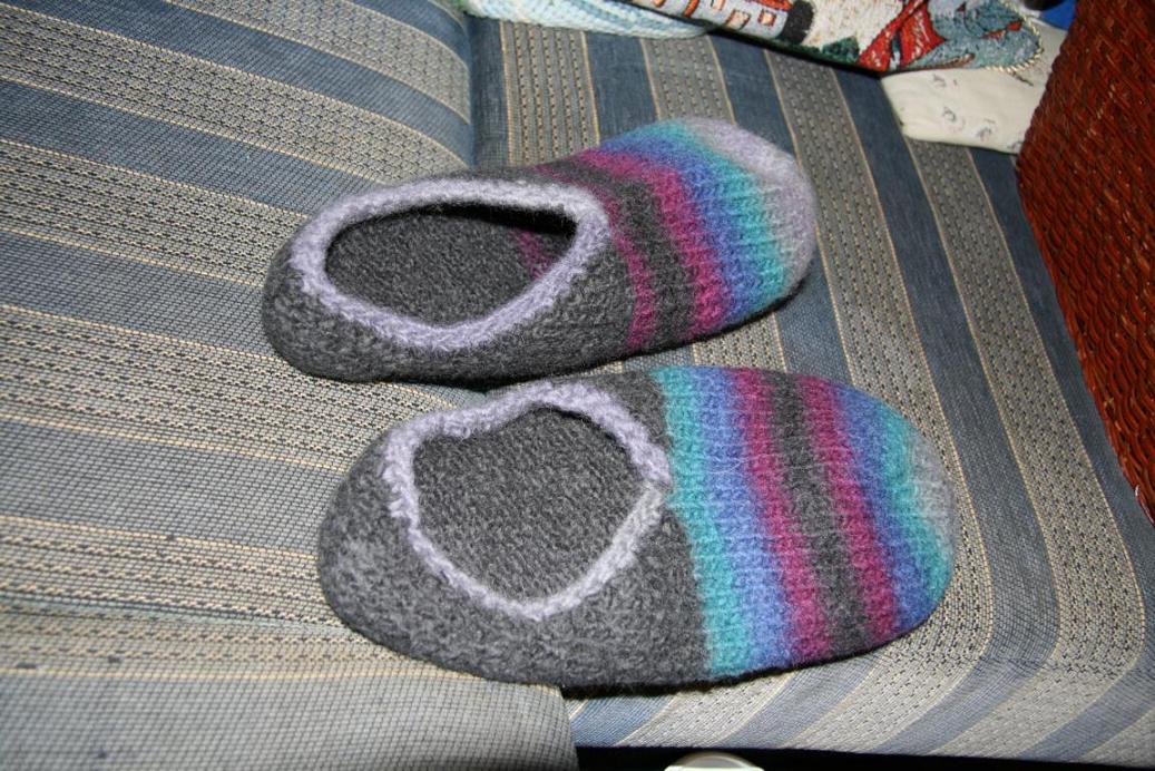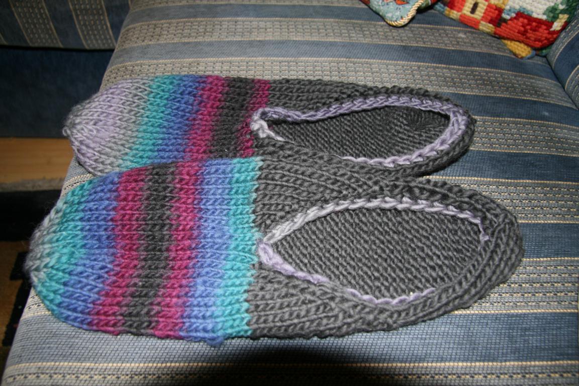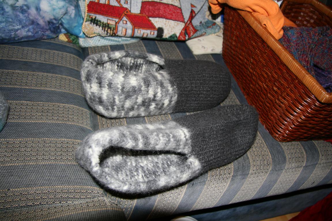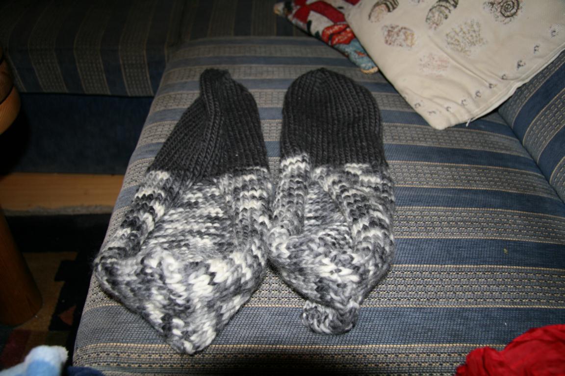 1. Hausschuhe nach der Anleitung der Aldiwolle. Problem:Ich habe Schuhgröße 43-44 und die Anleitung gab es für 42/43 und 44/45- Ich habe mich für 44/45 entschieden und die Hausschuhe gestrickt. Es entstanden monströse große Teile. Okke fand es lustig, da er seine Hände reinstecken konnte und die Dinger bis zu seinem Ellenbogen gingen...