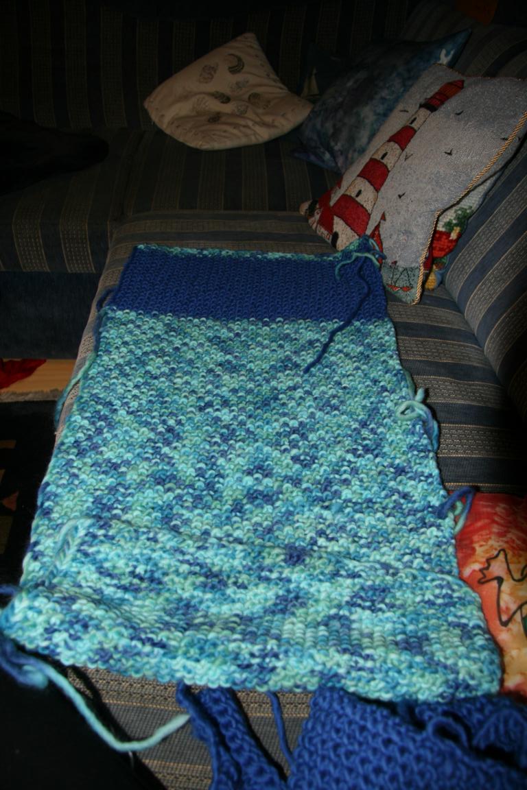Für die Schmalseiten und Riemen in einem Stück einen schmalen Streifen stricken und zwar 10 Maschen im Perlmuster 1re/1li ca. 180 cm