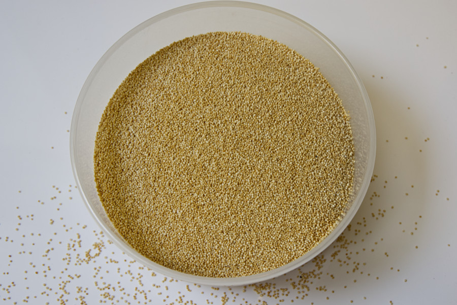 250 g Amaranth in 625 ml kochendes Wasser geben, aufkochen und 45 Minuten ausquellen lassen.