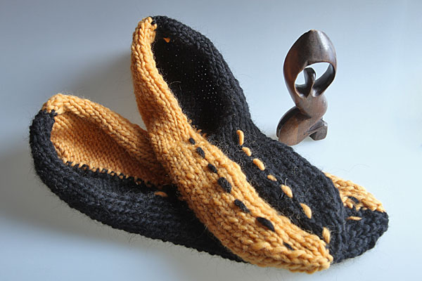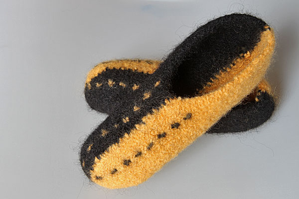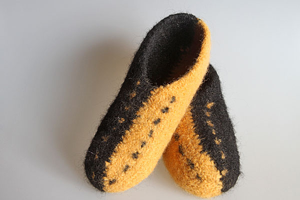 Hausschuhe stricken und filzen - 16. Paar in Gelb-Schwarz für SeeStern Größe 39