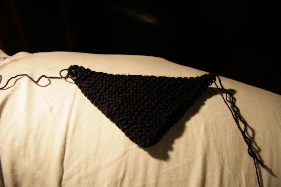 Das Quadrat aus Strumpfwolle wird diagonal zusammengefaltet und diebeiden Außenkantenseiten werden zusammengehäkelt.