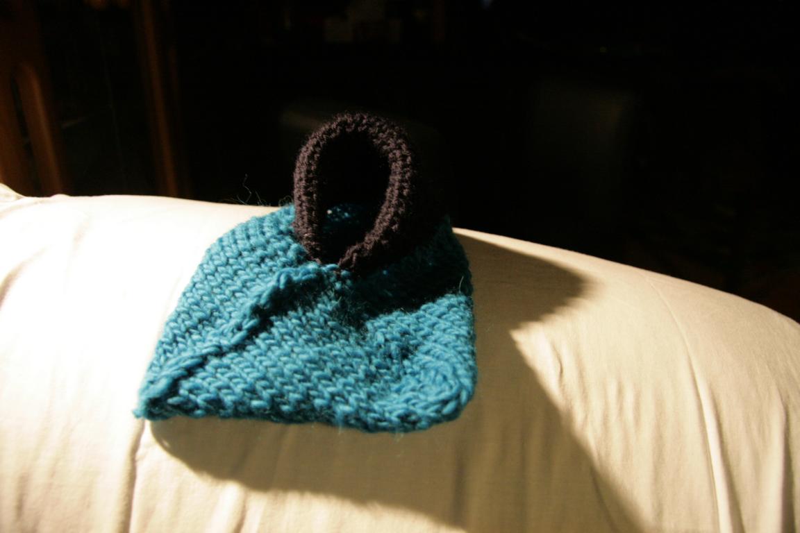Ich habe dann noch durch den Strickteil ein gehäkeltes Band(150M) zum zusammenziehen gezogen, damit die Schuhe nicht von den Füßen fallen ![]()