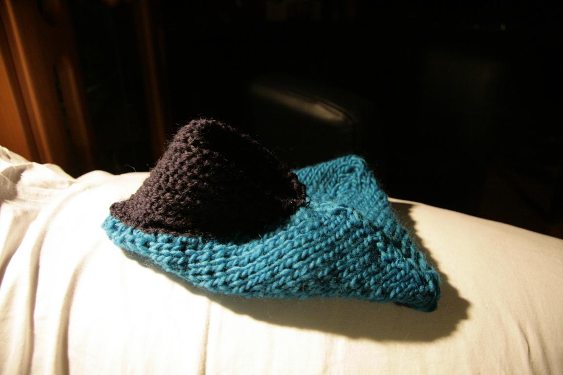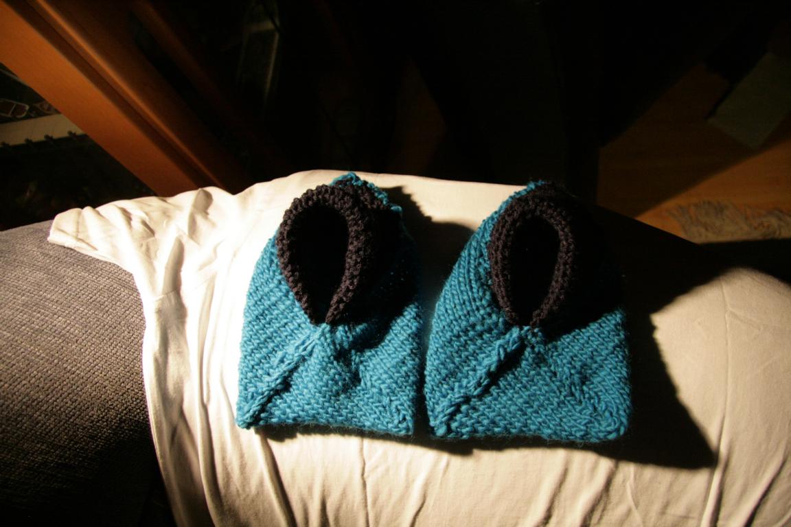 Die Schuhe sind eigentlich so gedacht, dass das Ende der Hacke wohl schon aus dem Strumpfstrickteil ist, weshalb sie auch nicht für Kleinkinder geeignet sind, die bereits laufen. Ich habe jetzt den Filzteil hinten etwas hochgebogen.