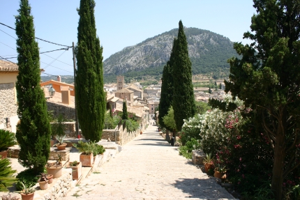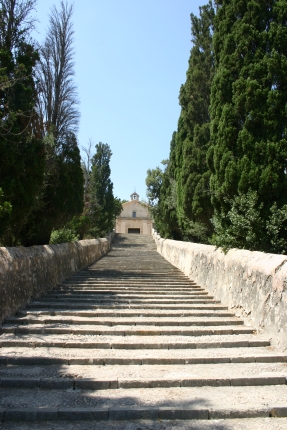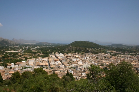 Ganz im Nordosten der Insel liegt die Halbinsel Formentor- sehr beeindruckende Felsformationen. Diese haben wir auf diesmal ebenfalls ausgelassen und sind stattdessen ein Stück ins Landesinnere, nach Pollensa. Pollensa liegt dem Berg Ternelles zugewandt. Umsiedler aus Alcudia, die im 14. Jht vor Piratenüberfällen weiter ins Landesinnere flüchteten, gaben der Stadt ihren Namen, der römischen Ursprungs ist: Polentia. Das Stadtbild stammt aus dem 16. Jahrhundert. Aus der Römerzeit ist eine alte Brücke erhalten geblieben. Die Straßen sind eng und verwinkelt, und es gibt eine Einbahnstraße nach der anderen- schnell hat man das Gefühl in einem Irrgarten zu sein. Ein bisschen erinnert es an eine maurische medina. Das besondere an Pollensa ist jedoch der Stadthügel, „Puig de Calvari“, 170m und mit einem Treppenweg mit 365 Stufen zu erreichen. Von oben hat man einen tollen Blick auf die Umgebung. Man kann auch mit dem Auto rauf fahren und dann die Treppe herunter laufen. So habe ich es gemacht und mit meinem Mann vereinbart, dass er mich dann unten am Platz abholt. Das klappte aber nicht, da auf dem Weg dorthin ein Laster den Weg versperrte und er keinen Weg mehr in dem Irrgarten der Straßen zu mir fand. Ich versuchte in der Zwischenzeit irgendwie an die Hauptstraße zu kommen, wobei ich ebenfalls fast die Orientierung verlor, so dass ich mich dann doch entschloss, zum Ende der Treppe zurückzukehren. In der Zwischenzeit hatte mein Mann das Auto irgendwo abgestellt und war ebenfalls zur Treppe gegangen, und so fanden wir uns doch wieder.