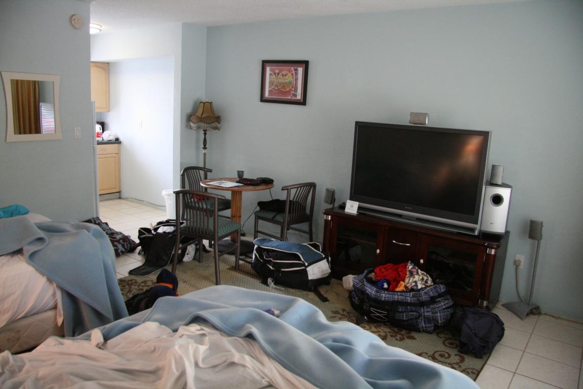 Wir haben ein recht großes Zimmer mit zwei Betten, ich denke 160 Breite - könnte also für Jan und mich gerne breiter sein... Stattdessen gibt einen gigantischen Fernseher mit dolby-Surround-System, einen Tisch mit drei Stühlen, eine kleine brauchbare Küche und ein rosa Badezimmer.