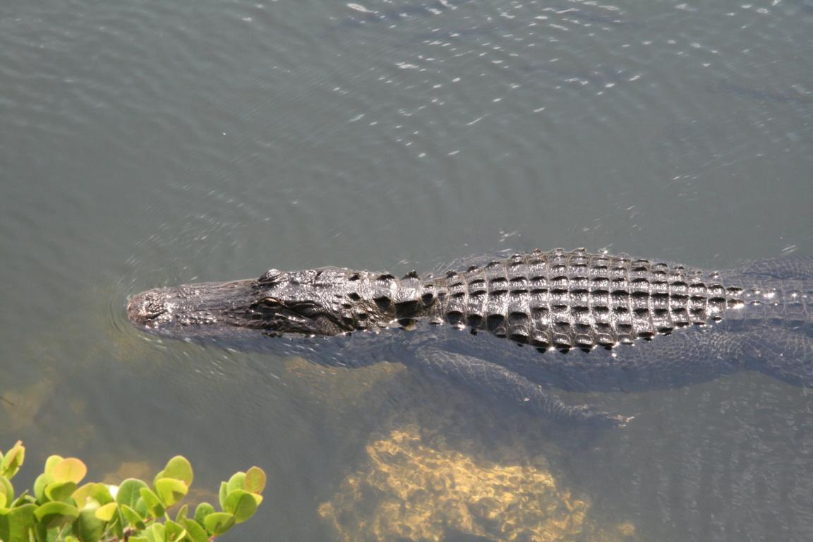 Vorher halten wir aber an einem Informationspunkt. Neben der Straße verläuft wieder ein Gewässer und in dem schwimmen jede Menge Alligatoren. Beim Informationspunkt befindet sich ein Steg, von dem aus man sie sehr gut beobachten kann.