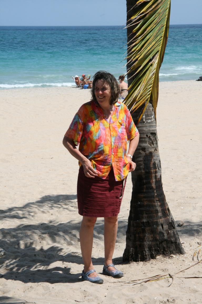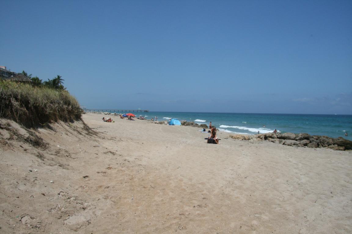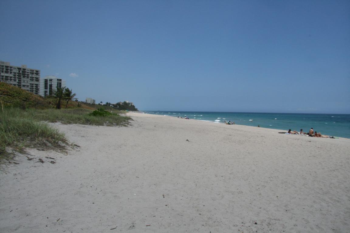 Der Strand ist recht leer, die Bebauung steht weit genug entfernt. Das Wasser hat 74 Fahrenheit- müssten 24 Grad sein. -