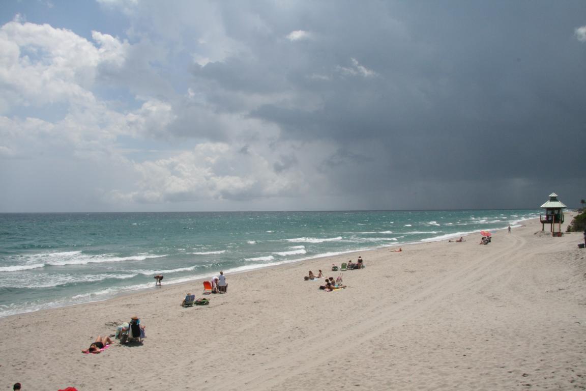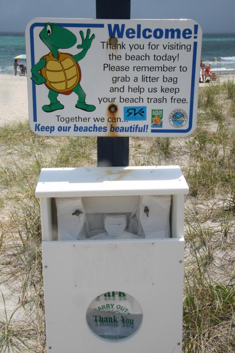 Am Strand finden wir diese nette kleine Schildkröte, die Müllbeutel anbietet, damit der Strand sauber bleibt. Eine Mole führt hier heraus. Rechts, Richtung Fort Lauderdale, hat sich der Himmel auf einmal schwarz gefärbt und die ersten Tropfen fallen. Auf der Mole sitzt ein Pelikan – Okke scheucht ihn auf und ich mache unter anderem dieses Foto. Die Tropfen werden dicker und wir rennen zum Auto. -