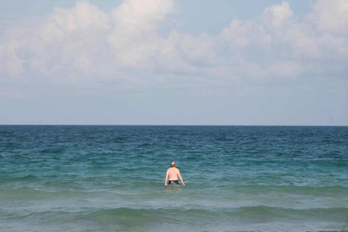 Wir kehren zurück zum Hotel und begeben uns nach einer Pause gegen 17 Uhr an den Strand, wo man es um diese Uhrzeit gut aushalten kann. WIr brauchen gute 10 Minuten bis zu der Stelle, wo wir an den Strand kommen, den wir vom Hotel aus fast sehen können....Links die Hochhausreihe, rechts kleine Häuser - direkt am Strandzugang das erste kleine Haus kann man mieten - das wäre dann ein Traumurlaub.... Jan maschiert ins Wasser, es geht flach rein, gibt Wellen und erscheint wärmer als 24 Grad.