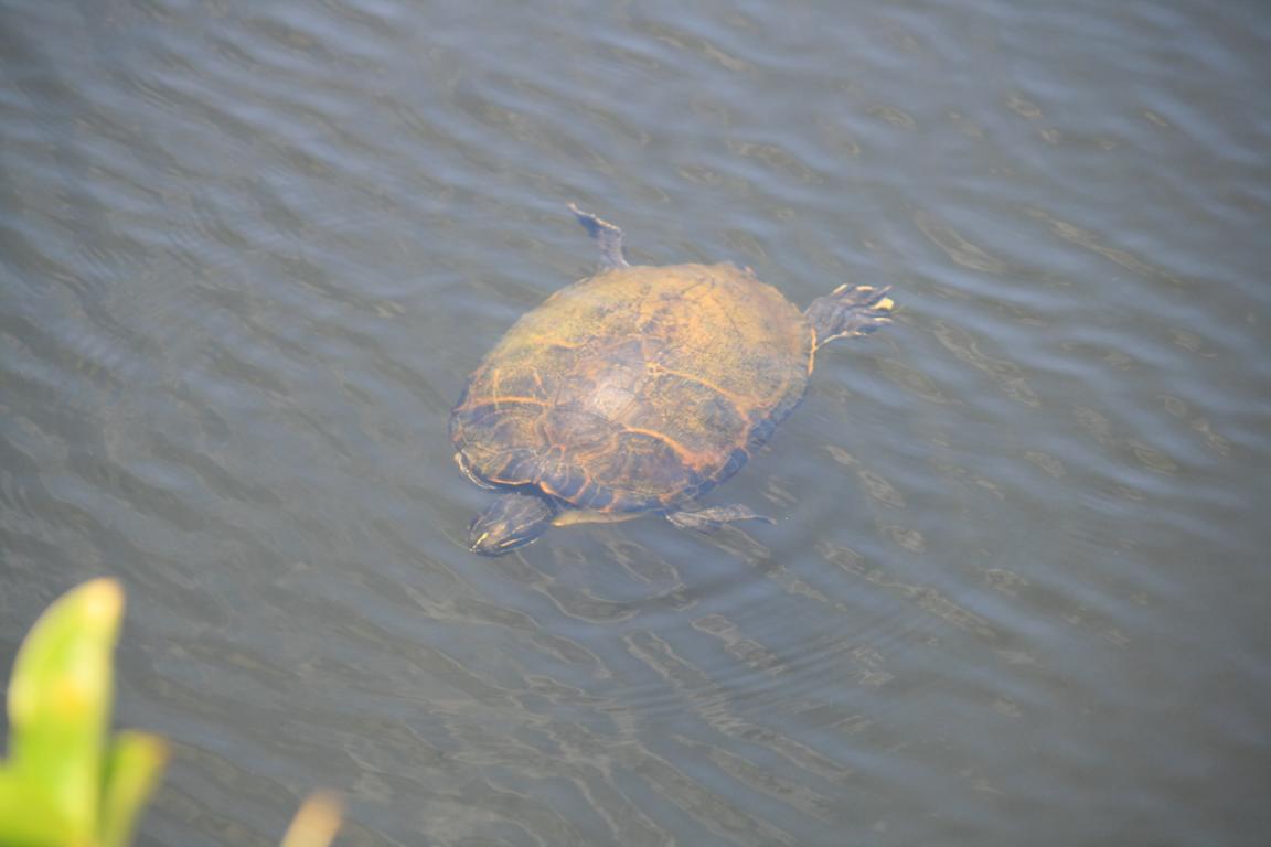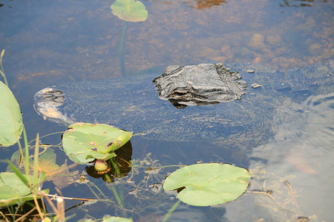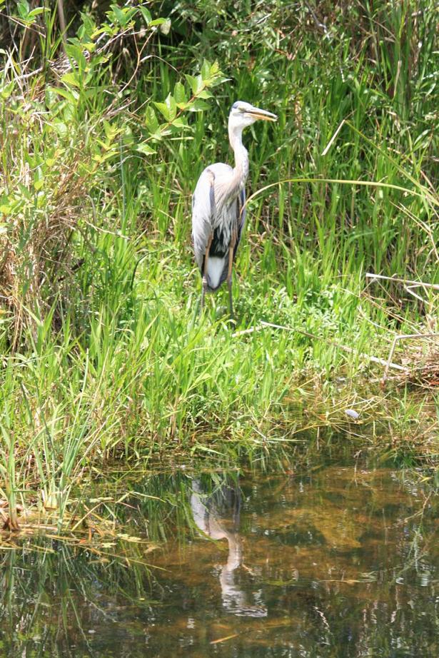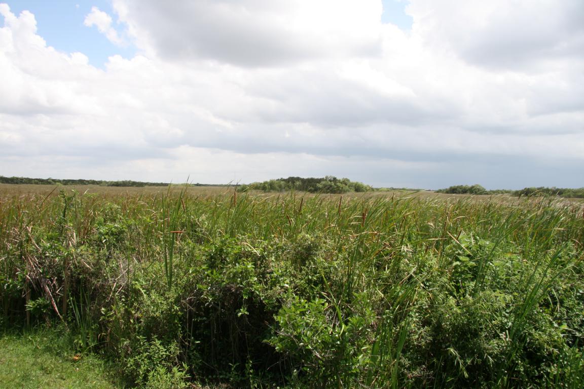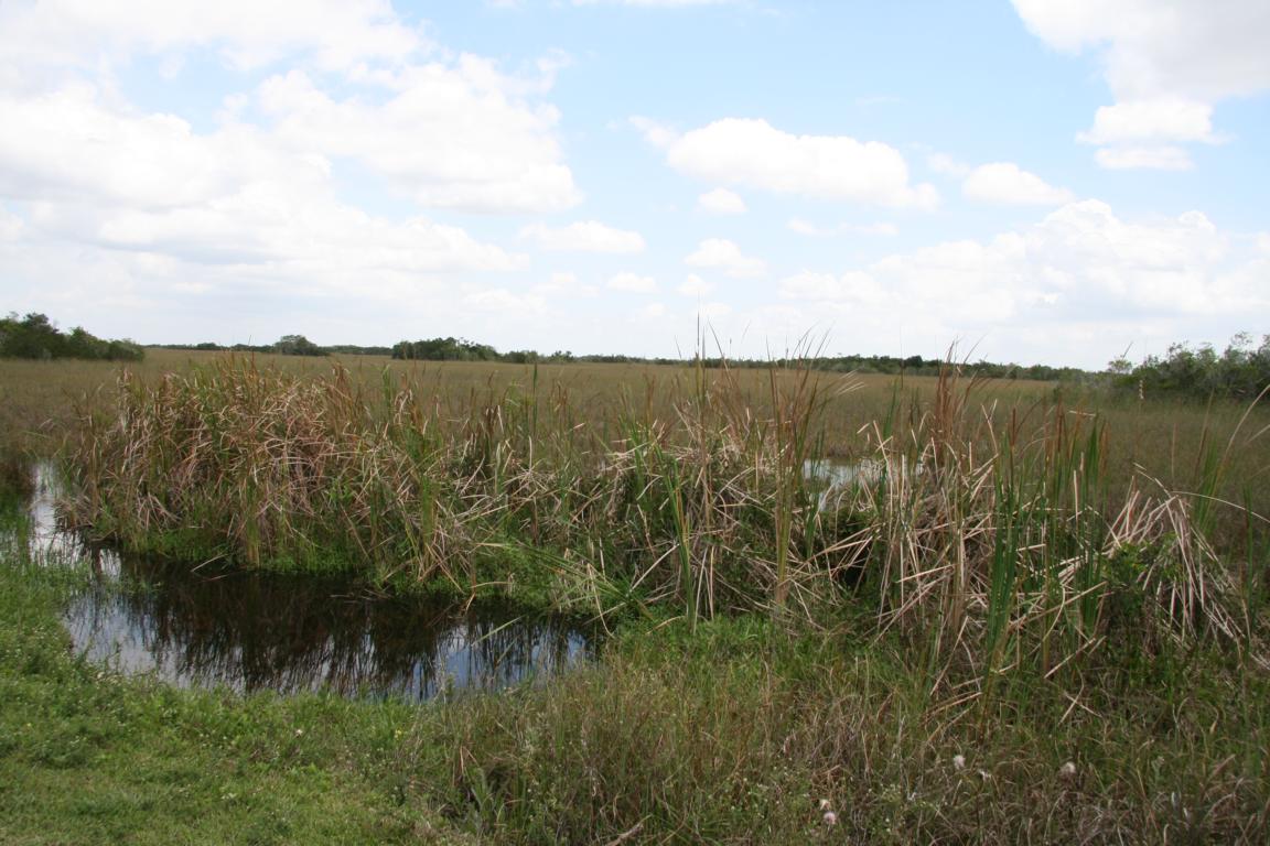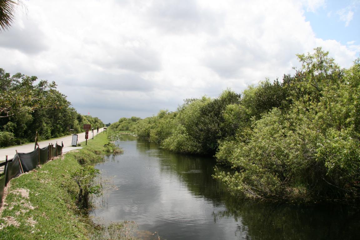Links vom Weg ist die Grasflusslandschaft - Everglades heißt der Fluss, der durch das Grass fließt, denn genaugenommen istt es ein Fluss. Und rechts ist ein Wassergraben, mit sehr vielen Seerosenblättern - die Blüten kommen gerade erst, an dem man immer wieder Schildkröten, Alligatoren und Vögel sieht. Hier auch ein Reihernest -