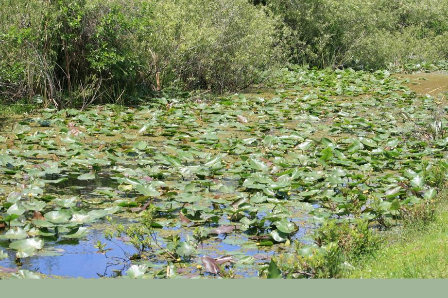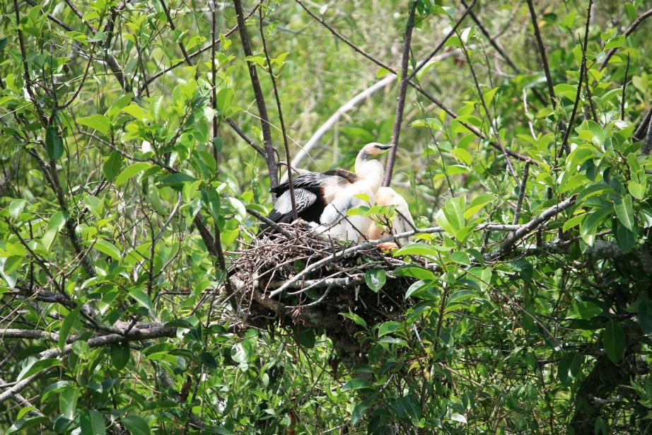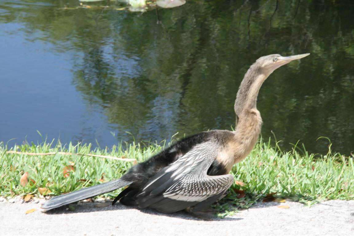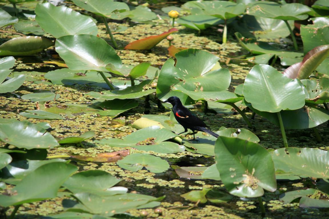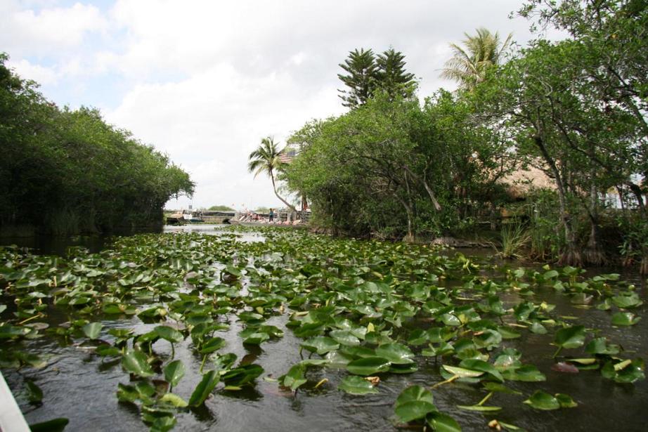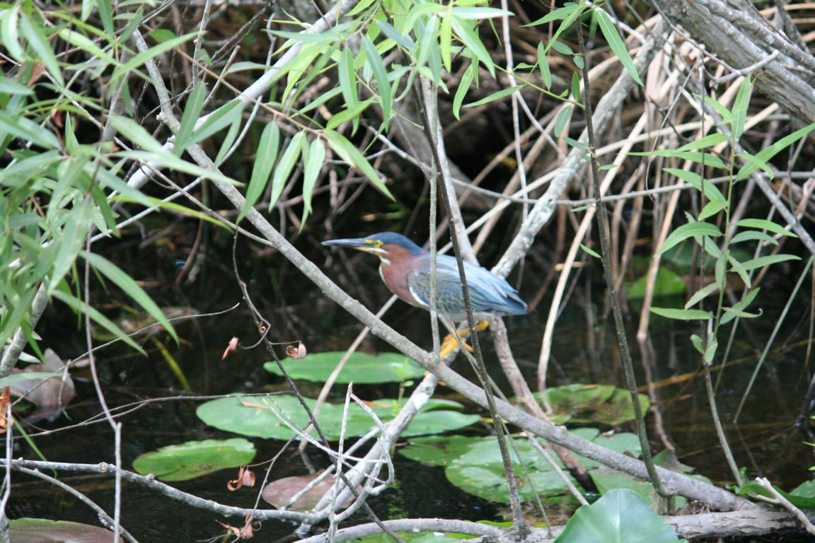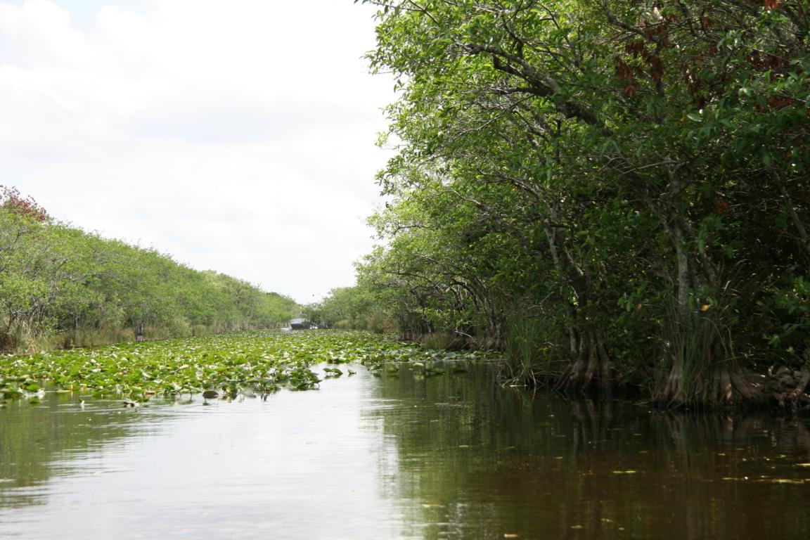 Links vom Weg ist die Grasflusslandschaft - Everglades heißt der Fluss, der durch das Grass fließt, denn genaugenommen istt es ein Fluss. Und rechts ist ein Wassergraben, mit sehr vielen Seerosenblättern - die Blüten kommen gerade erst, an dem man immer wieder Schildkröten, Alligatoren und Vögel sieht. Hier auch ein Reihernest -