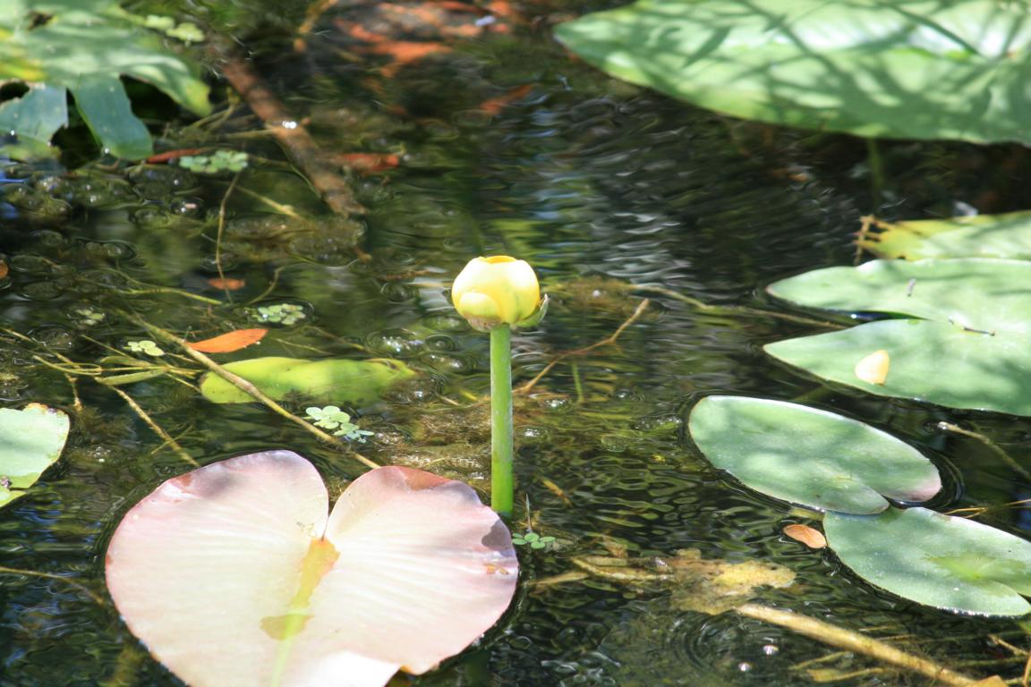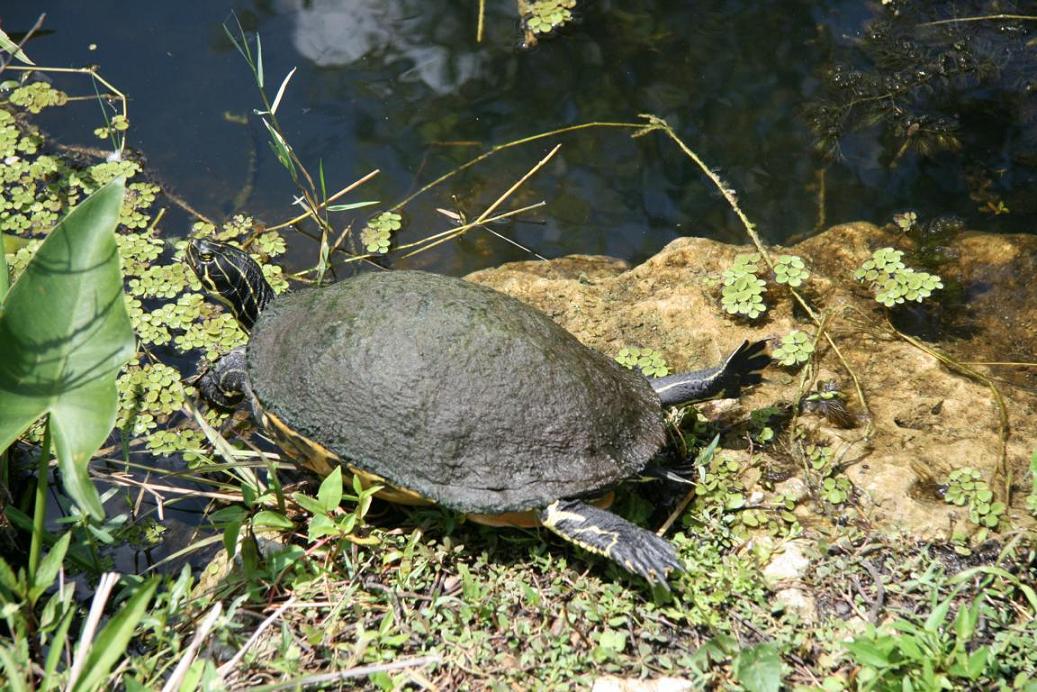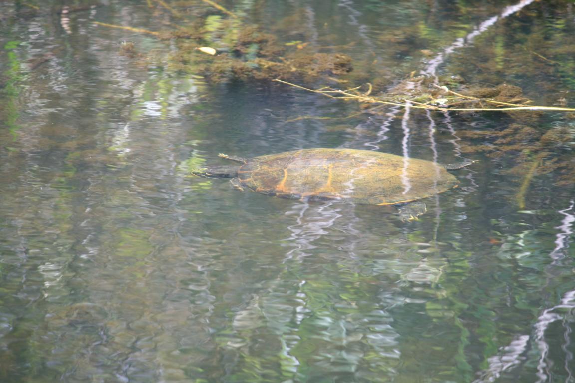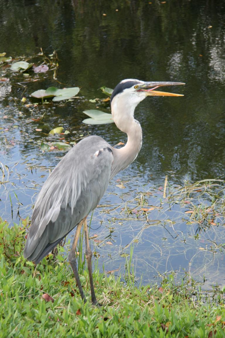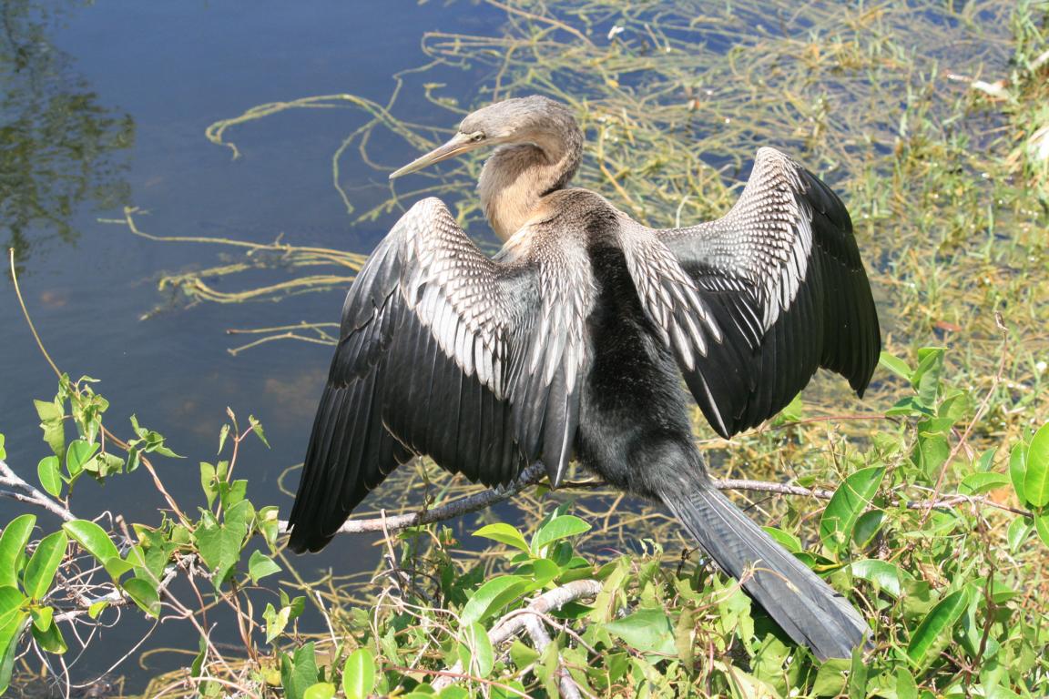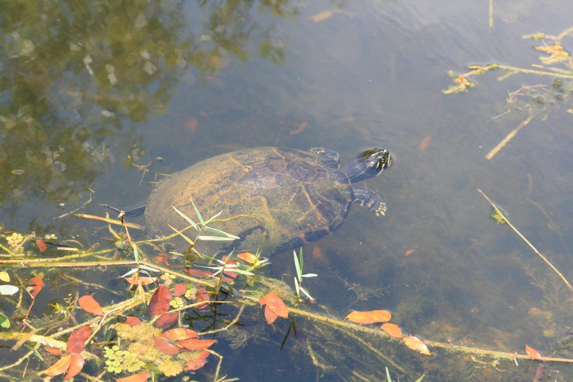 Links vom Weg ist die Grasflusslandschaft - Everglades heißt der Fluss, der durch das Grass fließt, denn genaugenommen istt es ein Fluss. Und rechts ist ein Wassergraben, mit sehr vielen Seerosenblättern - die Blüten kommen gerade erst, an dem man immer wieder Schildkröten, Alligatoren und Vögel sieht. Hier auch ein Reihernest -