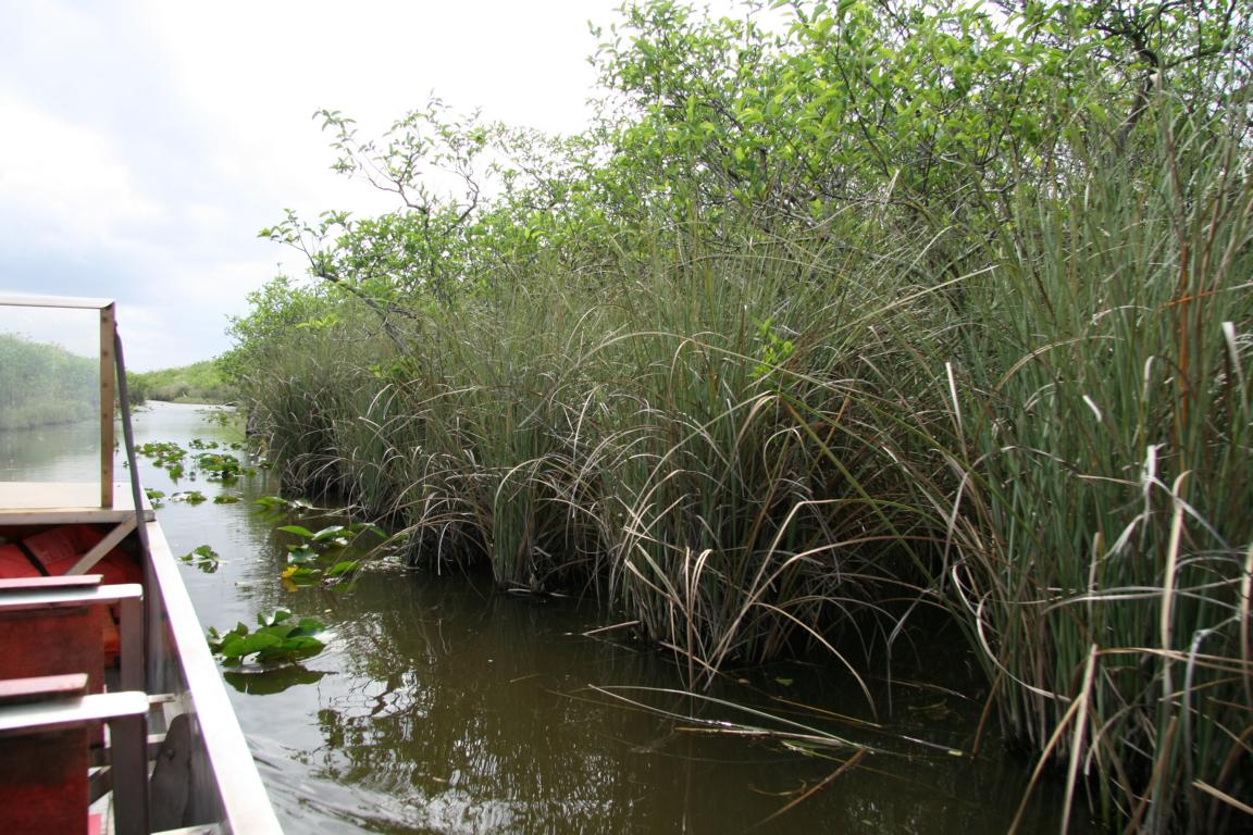 Zunächst geht es gemächlich den eher schmalen Fluss entlang, oder wie man es bezeichnen soll. Dann kommen wir in freieres Gelände, und nun nimmt das Boot richtig speed auf - ich muss mich festhalten und rechts neben mir spritzt das Wasser hoch - die Haare stehen uns vom Winde zu Berge oder wehen in alle Richtungen. Meinen Hut habe ich lieber abgenommen, Okke seinen auch. Hier erkennt man gut, dass Evergaldes Grasfluss bedeutet und ein tropisches Grasland ist