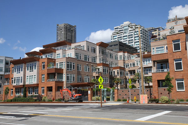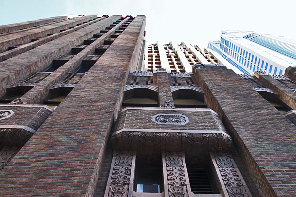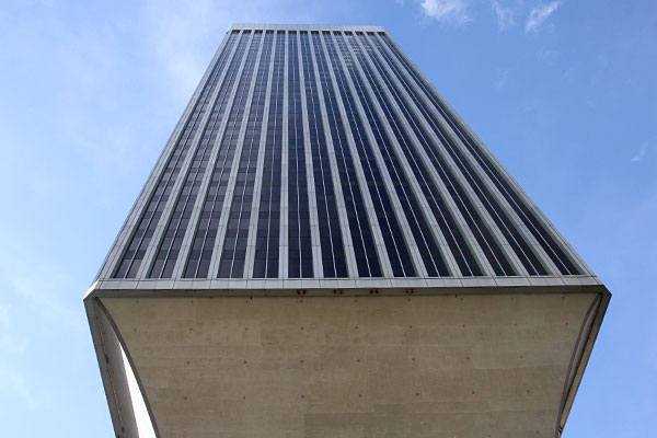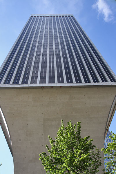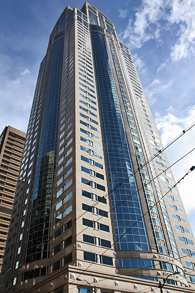 Der Rainier Tower, ein Wolkenkratzer an der 5th Avenue, entworfen von Minoru Yamasaki, hat 31 Stockwerke und wurde 1977 fertig gestellt. Ungewöhnlich ist die schmale Beton-Unterkonstruktion. (Bild 1+2)
