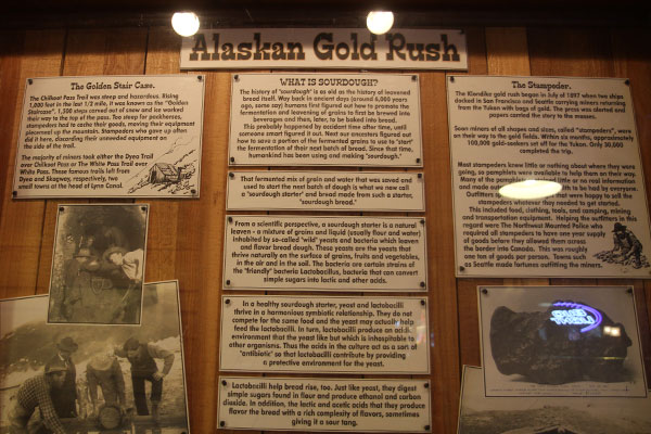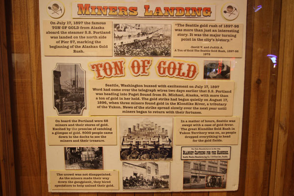 Am 17. Juli 1897 landete das Dampfschiff S.S. Portland hier am nördlichen Steg am Pier 57 und brachte die ersten Tonne mit Gold. Unter dem Jubel der ungefähr 5.000 Anwesenden am Pier, mussten die erfolgreichen 68 Goldsucher ihre Goldfunde vorzeigen. Und klar, der Alaskan Goldrausch nahm viele "gefangen", die nun auch ihre sieben Sachen packten und gen Norden zogen, um ihr Glück zu machen. Über 100.000 Männer zogen los, es waren nur wenige Frauen darunter.Interessant erzählt, ist auch die Geschichte des Sauerteigs (Sourdough), denn die Goldsucher mussten sich ernähren und dort wo sie lebten, gab es nicht viel.