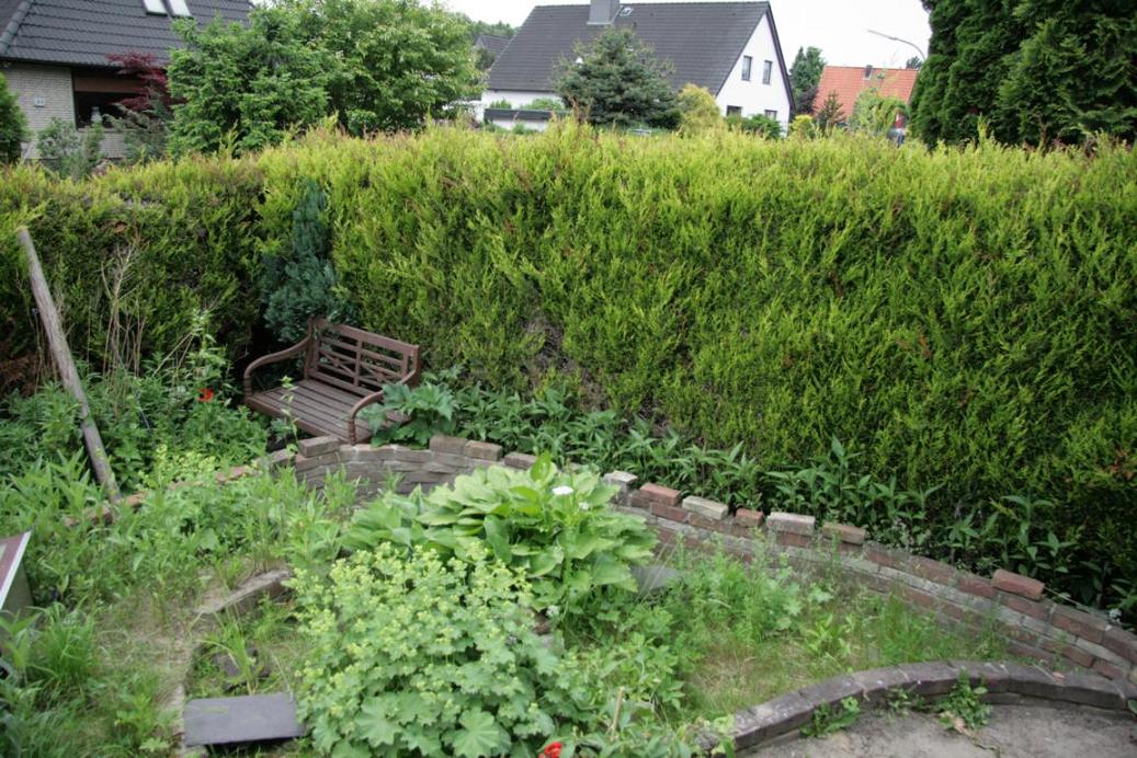Vorne habe ich die erste Ecke hinter der Hecke angefangen sauber zu machen, so dass die Gartenbank wieder ohne Brennnesseln zu benutzen ist - quasi als Bebobachtungsstelle für die Schildis, deren Terrarium davor liegt