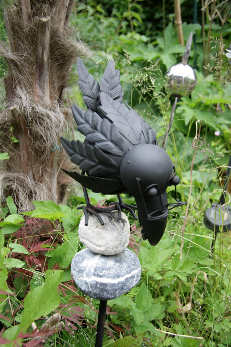 Der Vogelgarten hat gleichfalls Zuwachs bekommen und Jan hat den schon ganz verrosteten Blechraben aufgearbeitet -