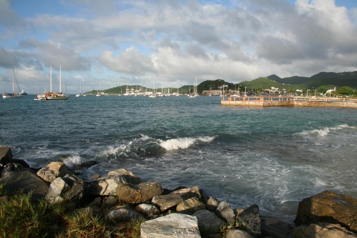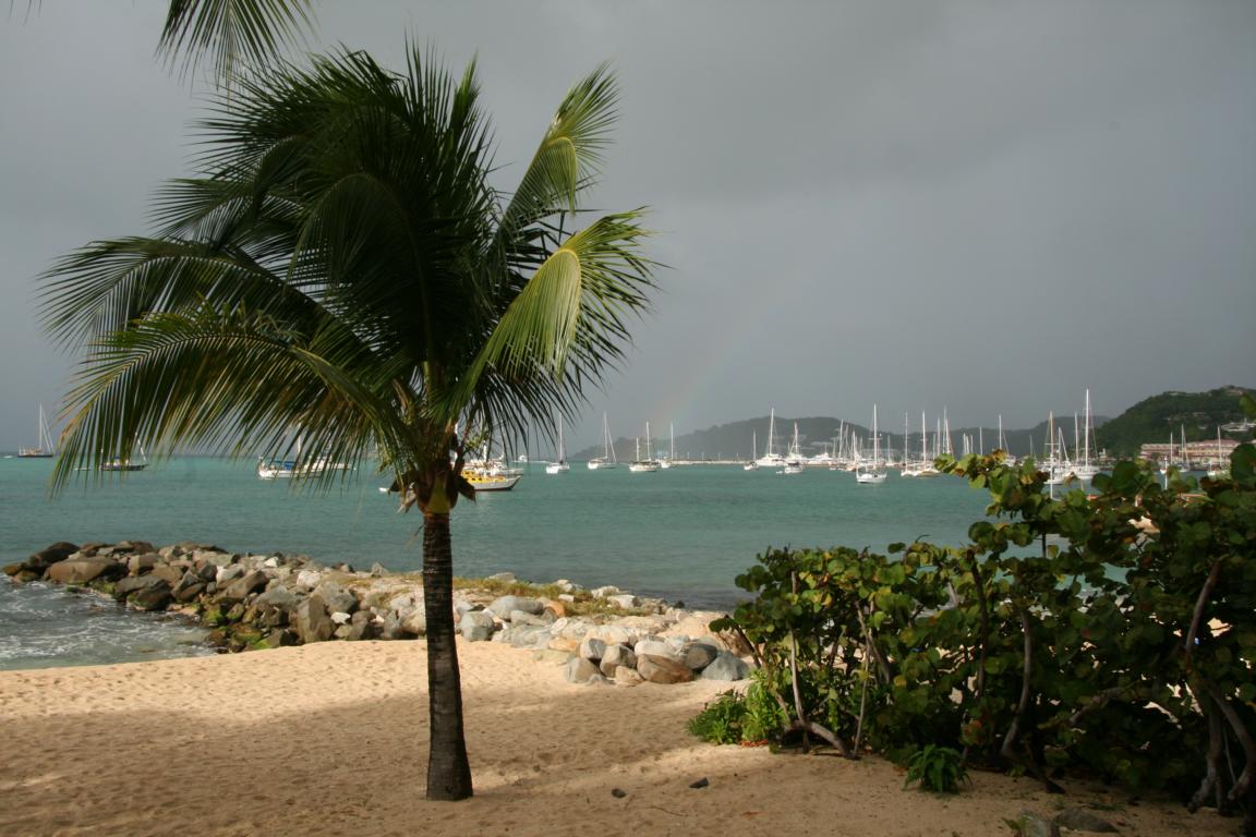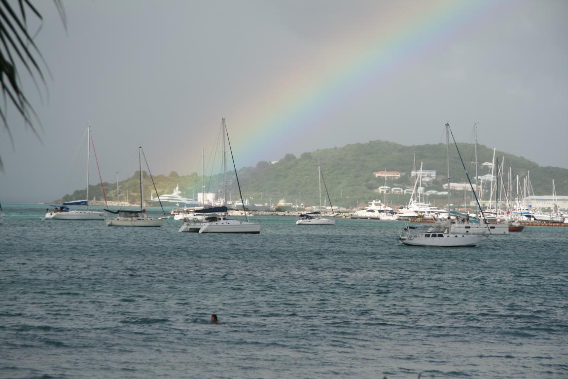Zurück in Marigot ist es mal wieder zugezogen. Es regenet und wir bekommen den nächsten Regenbogen.