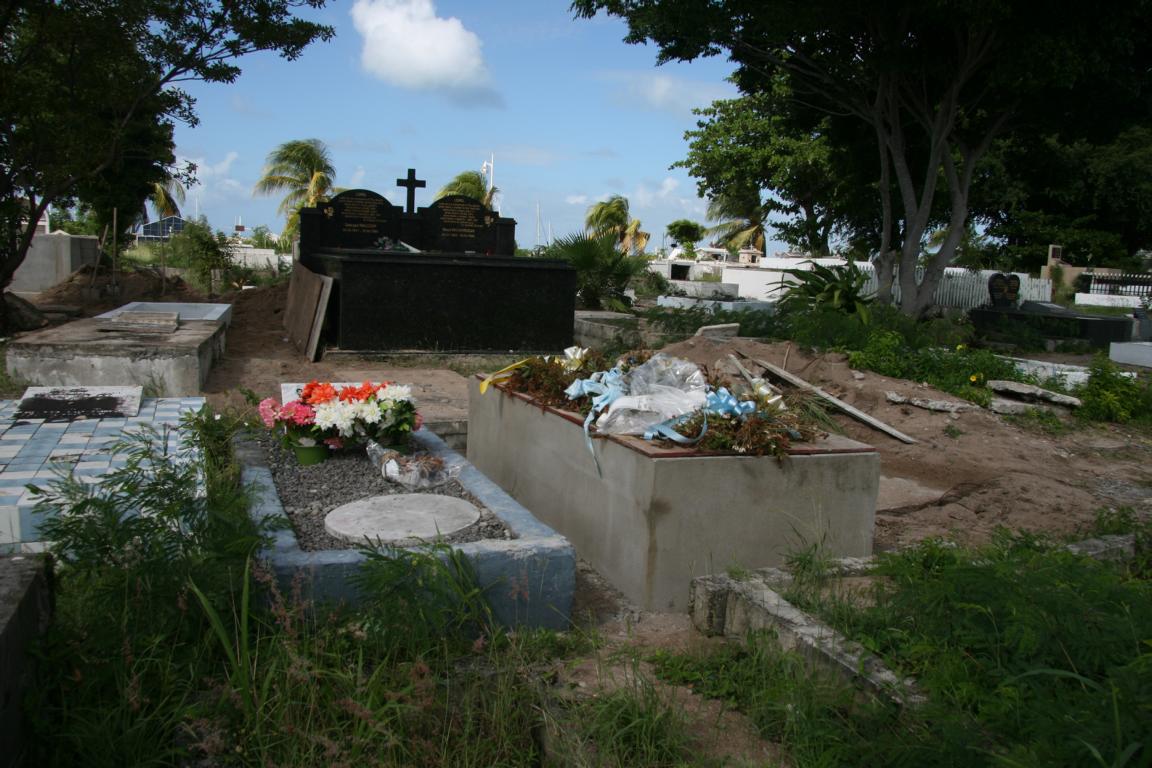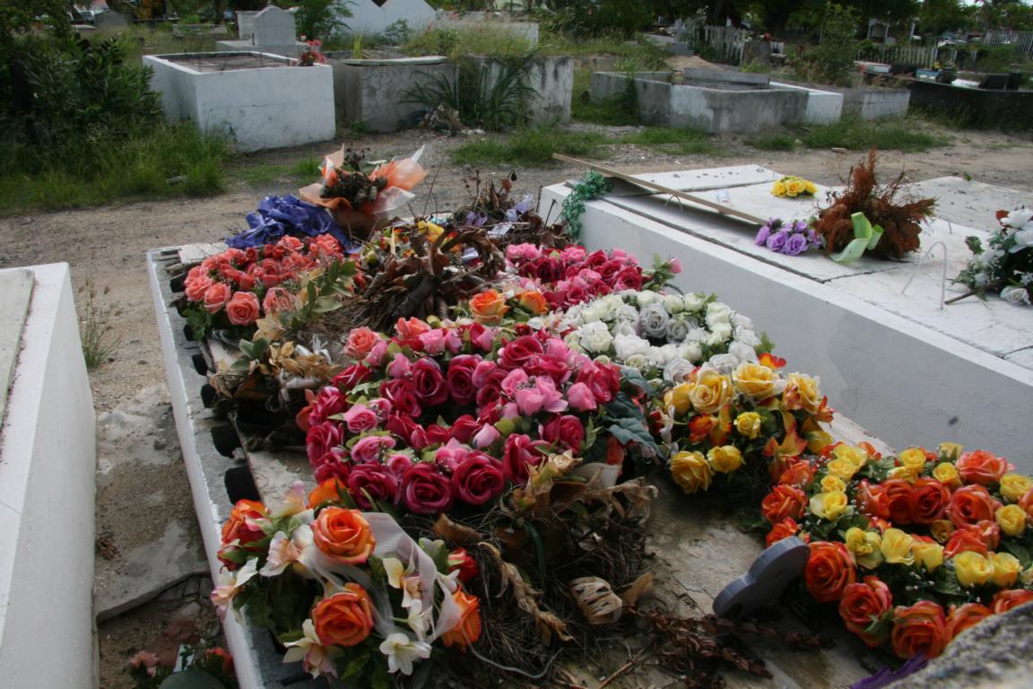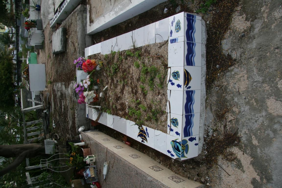 Auf dem Rückweg schaue ich kurz über die Mauer des Friedhofes... da will ich noch einmal in Ruhe fotografieren. Die Gräber sind gemauert - die Blumen durchweg künstlich...