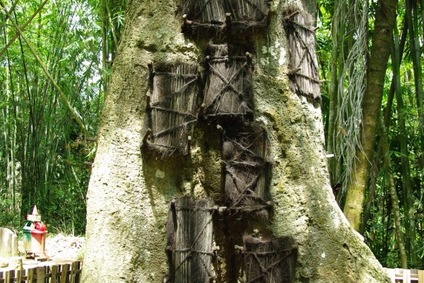 Also kommen Totenhelfer zum Abholen und bestatten die Leichen in einem großen Baum. Höhlen ihn aus und bringen eine Verriegelung an. Wenn der Baum austreibt und später seine Blätter verliert, ist das das Zeichen, dass die Seelen direkt ins Paradies kommen.
