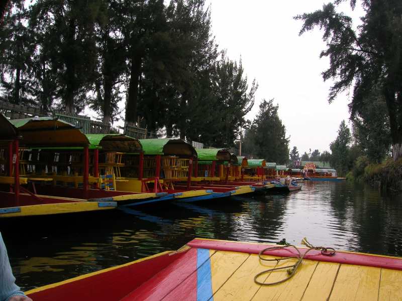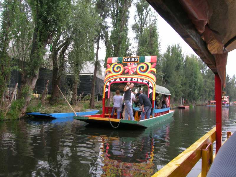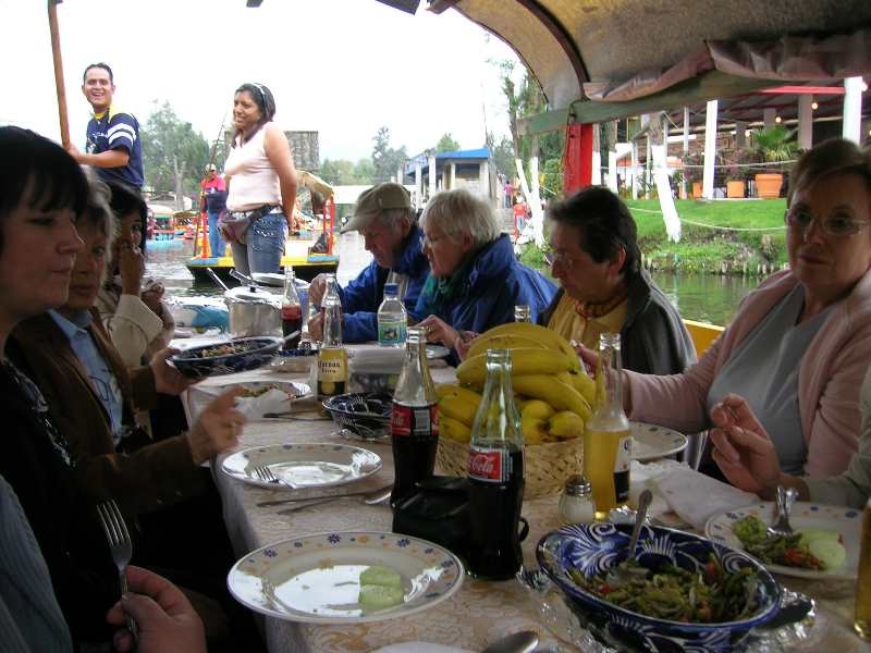 Vom Flughafen sind wir dann gleich mit dem Bus nach Xochimilco, einem Vorort von M.C. gefahren, zu den schwimmenden Gärten. Kanäle an denen heute noch Gemüse und Blumen gepflanzt werden. Es schien, als ob dort ein Volksfest gefeiert würde, viele Einheimische, die auch alle auf den ,„Trajineras“ (bunt bemalte Boote)die Kanäle entlang fuhren und dort ihr Essen einnahmen. Dort bekamen auch wir unser Mittagessen und es war doch ziemlich lustig, zumal dies das erste mexikanische Essen war.Sehr scharf natürlich. Es gab „pollo con mole“ einer Schokoladensauce. Nicht süss, wie man sich vielleicht vorstellen kann, sondern eine kräftige Sauce . Wenn ich mich richtig erinnern kann, soll dieses Rezept von den Nonnen erfunden worden sein.