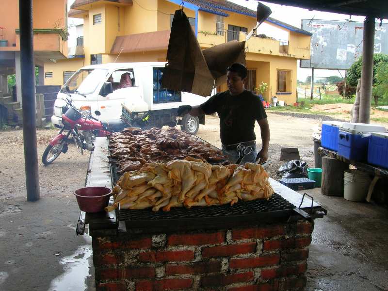 Auf dem Weg nach Villahermosa hielten wir der Strasse entlang an einem Restaurant (wenn man das so nennen darf) Die „Polli“ wurden draussen gegrillt, die Tische waren unter einer von Wellblech bedeckten Halle. Geschmeckt hat es trotzdem sehr gut. Und ich habe mir dabei nichts eingefangen. Wahrscheinlich war das die tägliche Ration Tequila, die wir immer von unserer schweiz. Reiseleiterin im Bus bekamen, die uns schütze.