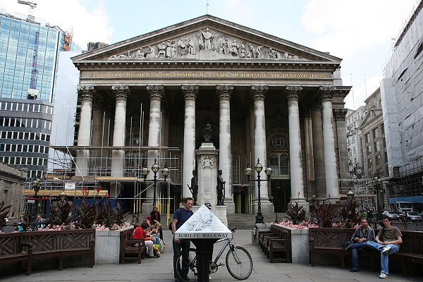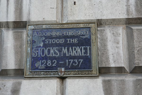 Das Gebäude der Royal Exchange wurde erstmals im 16. Jahrhundert gebaut. 1571 eröffnete Königin Elisabth I. die Börse in der Royal Exchange. Zweimal fiel das Gebäude einem Feuer zum Opfer (1666 und 1838). Zweimal wurde das Gebäude wieder aufgebaut, das letzte Mal im klassizistischen Stil. Königen Victoria eröffnete die Börse 1845 erneut. Heute befinden sich Luxus-Shops in diesem Gebäude.