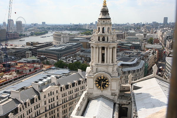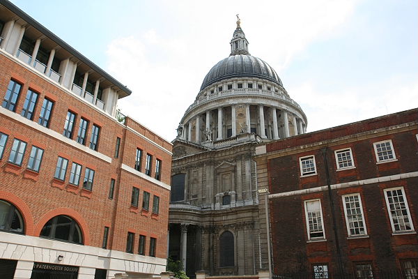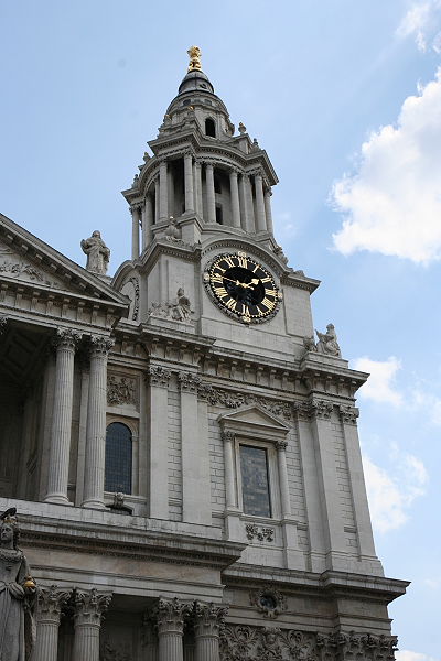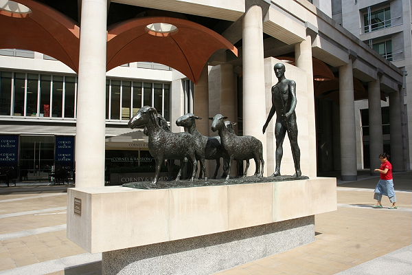 Wieder an der Masion Station angekommen, liefen wir nun zur St. Pauls Cathedral. Die mächtige Kuppel ist schon von weitem zu sehen. Zunächst gingen wir jedoch nördlich an der Kathedrale vorbei und kamen zu dem Paternoster Square mit seinen modernen Gebäuden, u. a. London Stock Exchange und der 23 m hohen Paternoster Säule. Dieser Platz wurde erst 2003 fertig gestaltet. Am Rande steht eine Skulptur aus Bronze Schafe und Schäfer von Elisabeth Frink.