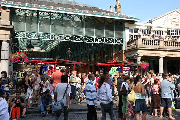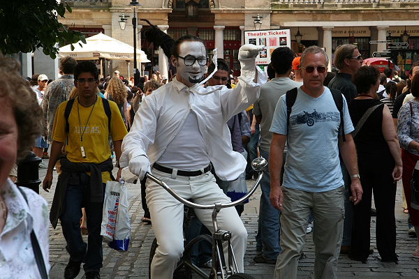 Wir nehmen die Underground und fahren von St. Pauls nach Covent Garden. Früher war es ein Obst- und Gemüsemarkt, heute ist Covent Garden eine Touristenattraktion. Rund um und auch in den Hallen scharen sich die Touristen. Straßenkünstler, Akrobatikkünstler, Pantominen, Clowns und Musiker unterhalten die Touristen und erhoffen sich manchen Penny.