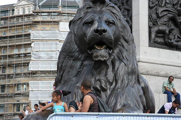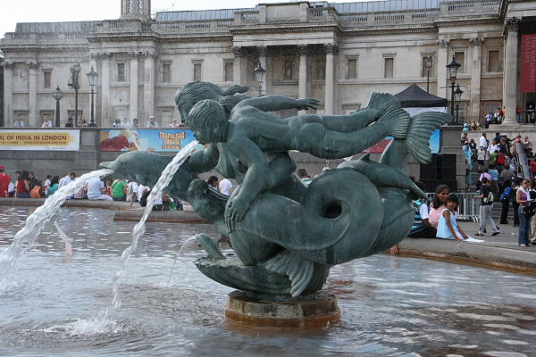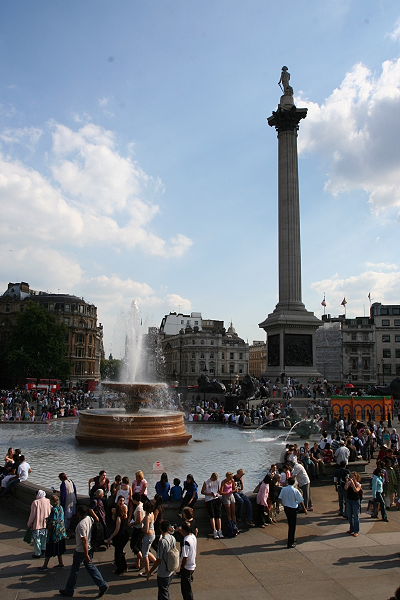 Wir verließen Covent Garden und gingen zu Fuß durch die alten Gassen Londons bis wir den Trafalgar Square erreichten. In der Mitte des größten Platzes von London steht die Nelson Säule. Admiral Nelson starb 1805 während der Seeschlacht von Trafalgar, in der die Briten die Franzosen/Spanier besiegten. Oben auf der Spitze der Säule steht Admiral Nelson. Um den Löwenbrunnen und die Reiterstatue saßen und standen Menschen aus aller Welt. Es war hier proppenvoll. Teile des Platzes waren abgesperrt, denn vom 2. - 19 August fand hier das Trafalgar Square Festival 2007 statt.