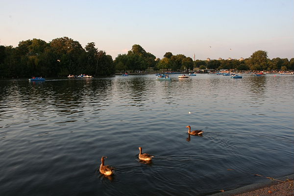 Der Hyde Park ist etwa anderhalb Quadratkilometer groß. Inmitten des Parks ist der See The Serpentine. Wir sehen viele Londoner und Nicht-Londoner, die spielen, picknicken, Boot fahren, Enten und Schwäne füttern und spazieren gehen... Es ist Wochenende und hier hat man Platz. Wir gehen entlang des Sees bis zum Lady Di Gedächtnisbrunnen. Dieser wurde 2004 von Königin Elizabeth II. eingeweiht. Die Öffnungszeiten sind im Sommer von 10- 20 Uhr und im Herbst nur bis 16 Uhr. Danach werden die Besucher herausgebeten und die Tore geschlossen. Wir setzen uns am Rande des Wassers und tauchen unsere müden Füße und Hände ins kühle Wasser. Das ist ausdrücklich erwünscht.