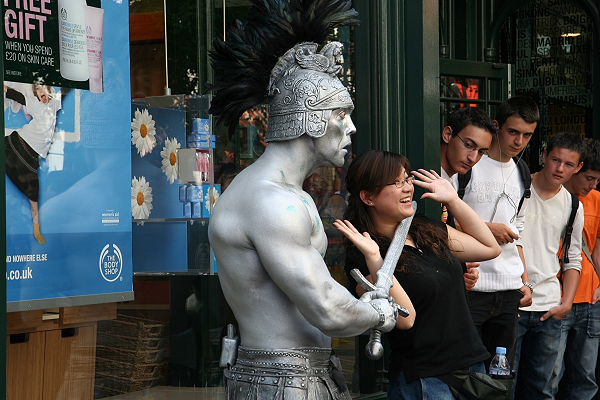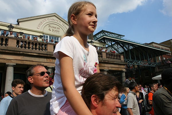 Wir nehmen die Underground und fahren von St. Pauls nach Covent Garden. Früher war es ein Obst- und Gemüsemarkt, heute ist Covent Garden eine Touristenattraktion. Rund um und auch in den Hallen scharen sich die Touristen. Straßenkünstler, Akrobatikkünstler, Pantominen, Clowns und Musiker unterhalten die Touristen und erhoffen sich manchen Penny.