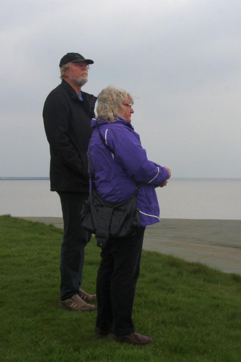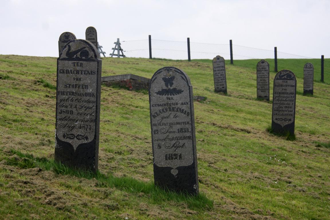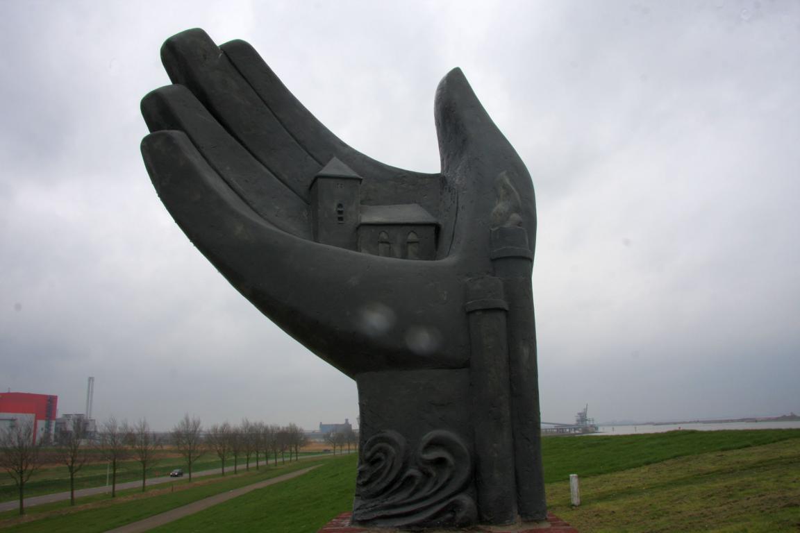 Auf dem Rückweg kommen wir an einem interessanten Ort vorbei.Hier stehen Grabsteine auf dem Deich und eine Hand ragt in den Himmel.Wir lesen,dass dort einmal ein Ort war, der der Erhöhung des Deiches und der Industrieansiedlung bei Delfzijl weichen musste. Dort war der Friedhof -und der ist immer noch unter dem Deich... nur die Grabsteine hat man auf den Deich gestellt. Auf dem alten Deich stand die kleine Kirche des Ortes- und die findet sich jetzt in der Hand wieder. Wir lesen auch,dass -unfassbar - die Originalbronzehand am 9.2.2011 gestohlen wurde... das Problem kennen wir aus Deutschland. Metalljäger nehmen keine Rücksicht vor Andenken. Auf dem Grab von Hagenbeck wurde ein Bronzelöwe vor kurzem gestohlen, der dort seit Ewigkeiten stand-...