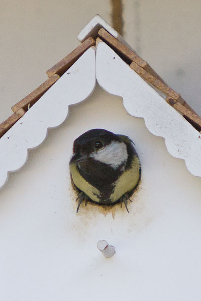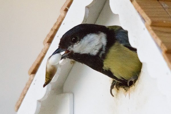 Die Meisen bringen auch oft etwas aus dem Nest raus. Ich kann mir nur vorstellen, dass es Unrat ist, welches sie entsorgen. Aber auch kleine Tierchen hatten sie schon im Schnabel. Vermutlich nicht essbares Ungeziefer.