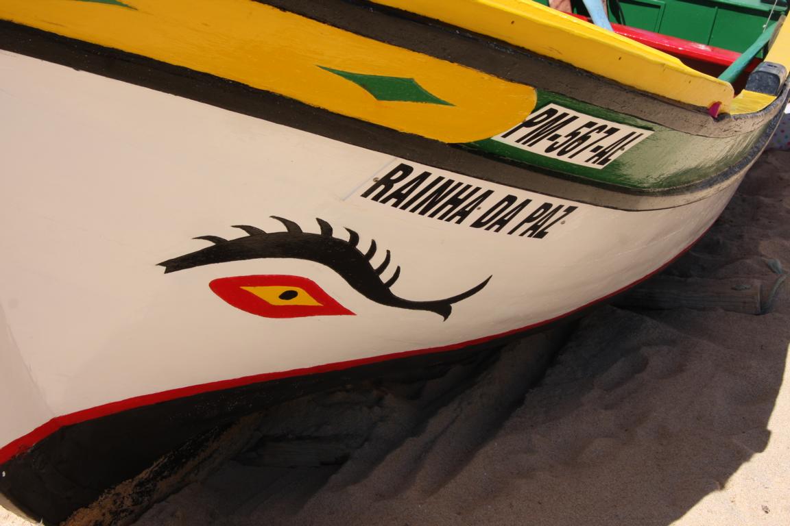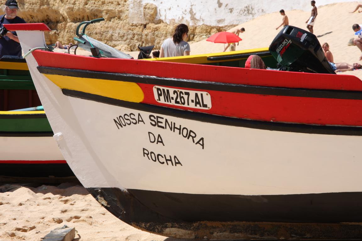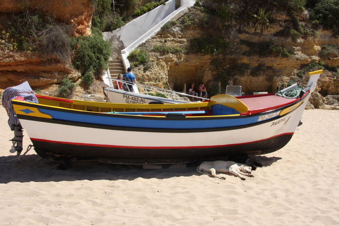 Der Ort Carvoeiro ist wirklich ein netter kleiner Ort, eingegrenzt von Felsen rechts und links. Mit alten Fischerbooten kann man von dort aus Ausflüge in die Grotten machen.Und als wir am Strand sind, wird gerade so ein Boot fertig gemacht -