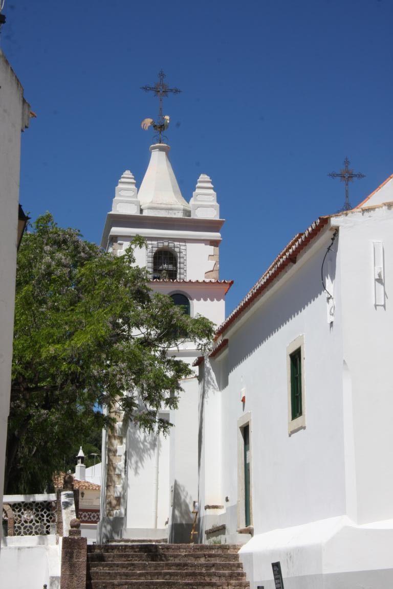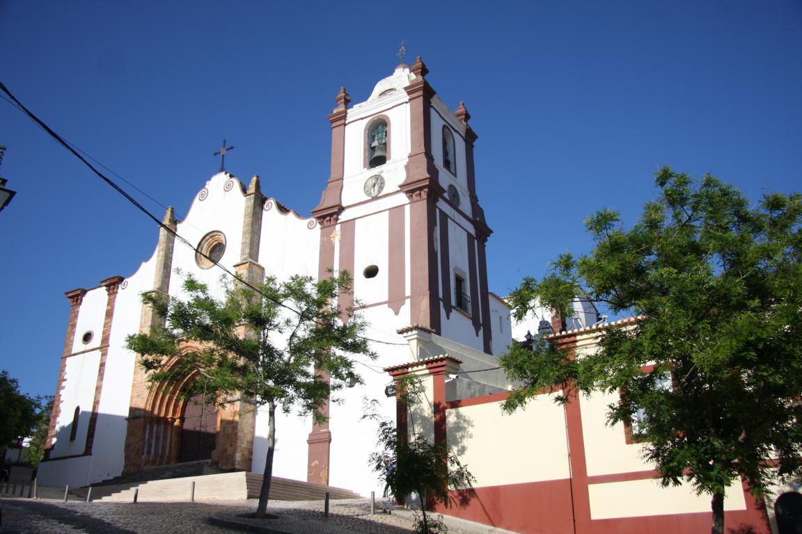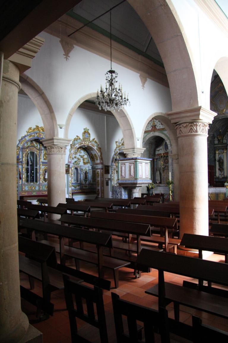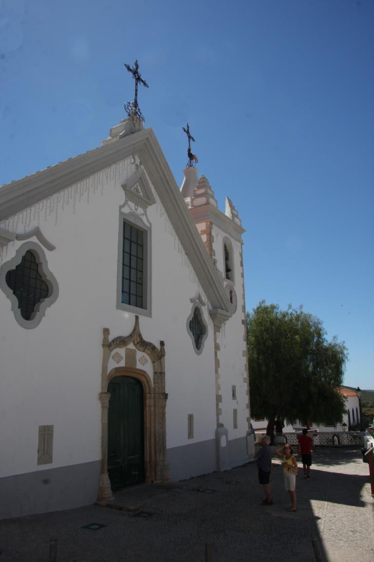 Wir erreichen die Rua da Igreja und kommen zu einer Kirche, die im 15. Jh. erbaut und beim großen Erdbeben 1755 zerstört wurde. Dicke Taue und Knoten aus Stein zieren das Hauptportal. Die Kirche von innen anzuschauen kostet keinen Eintritt. Es gibt 3 Kapellen mit vergoldeten Altären aus Kastanienholz und Holzfiguren von bekannten portugiesische Bildhauern, deren Namen uns aber alle nichts sagen. Wie bei vielen Kirchen an der Algarve finden sich auch hier viele gekachelte Wände