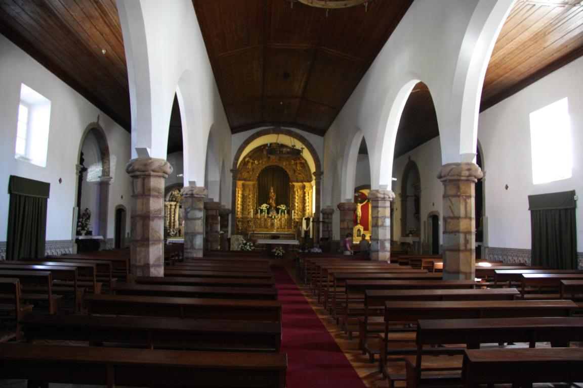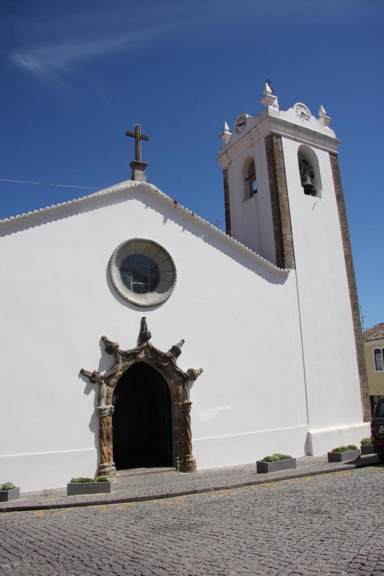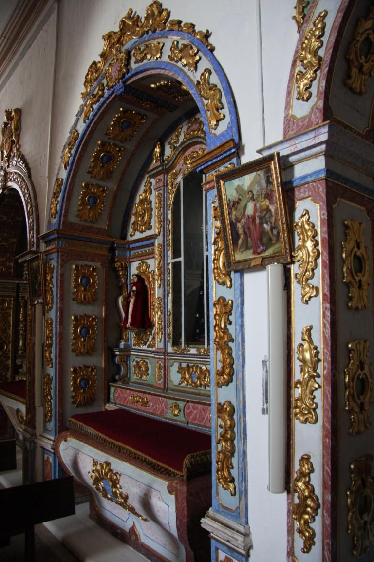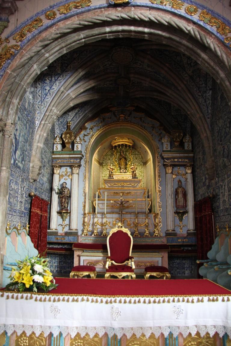 Wir erreichen die Rua da Igreja und kommen zu einer Kirche, die im 15. Jh. erbaut und beim großen Erdbeben 1755 zerstört wurde. Dicke Taue und Knoten aus Stein zieren das Hauptportal. Die Kirche von innen anzuschauen kostet keinen Eintritt. Es gibt 3 Kapellen mit vergoldeten Altären aus Kastanienholz und Holzfiguren von bekannten portugiesische Bildhauern, deren Namen uns aber alle nichts sagen. Wie bei vielen Kirchen an der Algarve finden sich auch hier viele gekachelte Wände