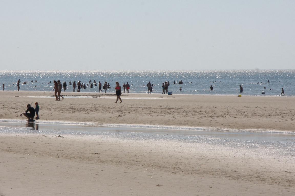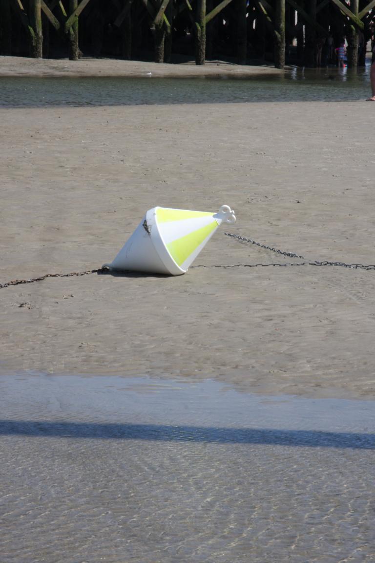 #Die Buden am Strand stehen auf hohen Stelzen, da wir hier Ebbe und Flut haben und bei Flut der Strand auch schon mal kräftig überspült werden kann.... Man sieht, wir sind bei Ebbe da. Dort, wo ich bei Bild 3 gerade stehe und zurück Richtung Land fotografiere, ist bei Flut Wasser. Hinten die bunten Punkte sind hunderte und mehr kleine Windschutzzelte, und dahinter geht der Strand weiter und die AUtos parken drauf -